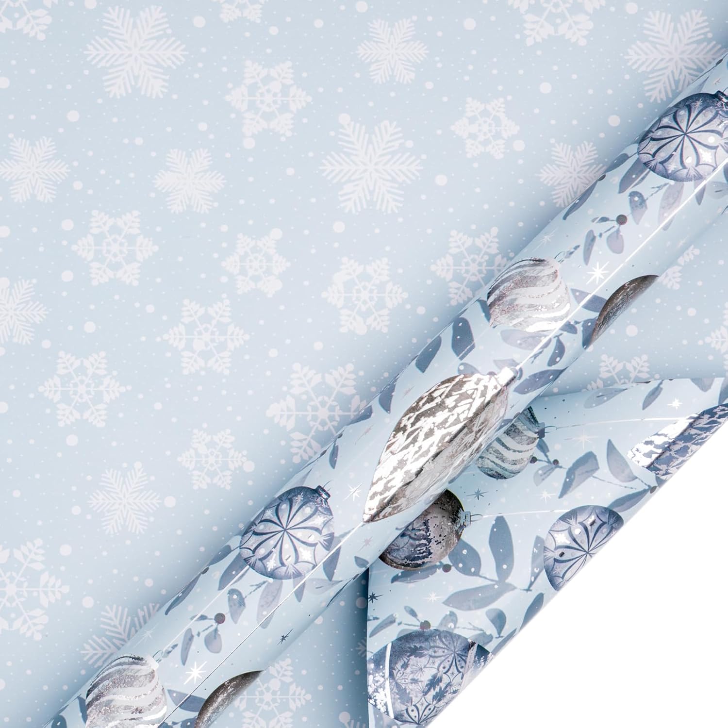 - Elegant Reversible Design: One side features vintage-inspired Christmas ornaments in silver, grey, and metallic tones hanging amidst frosted foliage; the reverse showcases delicate white snowflakes scattered over a soft blue background, offering a serene winter look.