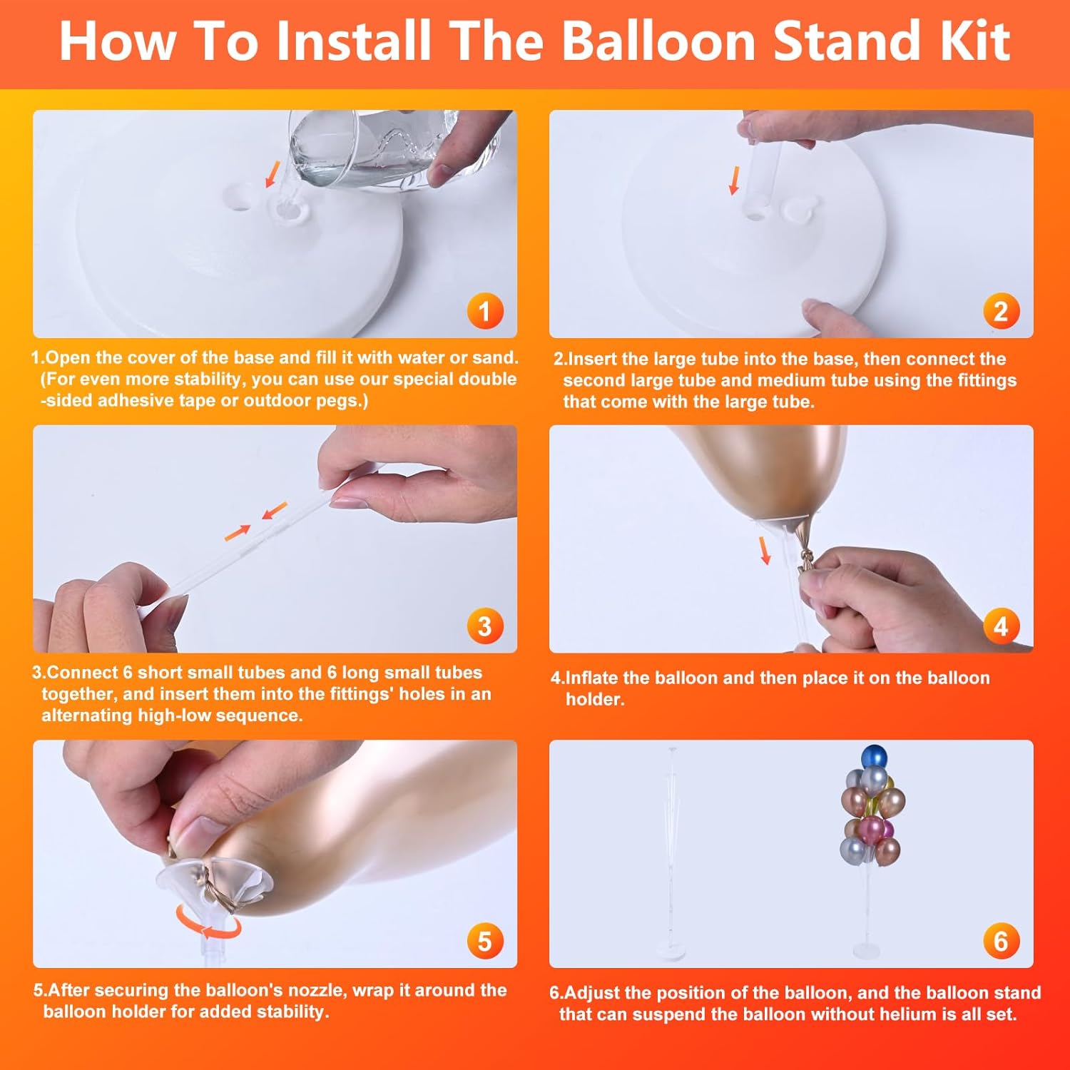 - UPGRADED BASE - Enhanced Stability for Windy Areas: When using the balloon stand in windy conditions, simply filling the base with water might not be enough to prevent tipping. That's why we provide floor spikes and double-sided tape to secure the balloon stand based on your specific situation. Use the double-sided tape for flat floors or table tops, and the ground spikes for grassy areas. No more worrying about balloon stands being blown over by the wind!