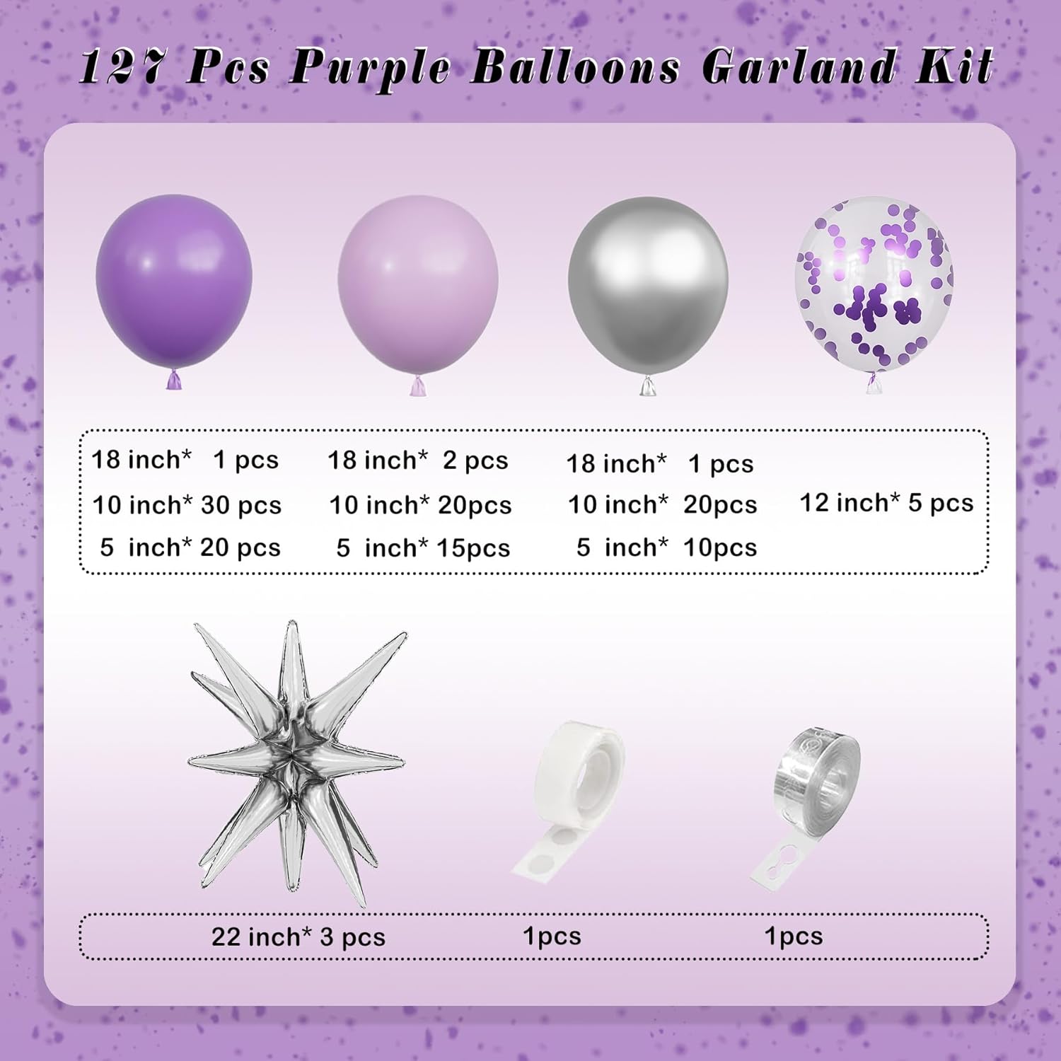 - 【Package Include】- The purple balloon arch kit includes silver starburst balloons 22”3pcs,lavender purple balloons(18”1pcs+10”20pcs+5”15pcs),light purple balloons(18”2pcs+10”30pcs+5”20pcs),metallic silver balloons(18”1pcs+10”20pcs+5”10pcs),purple confetti balloons 12”5pcs,balloon glue dot;balloon decorating strip.
