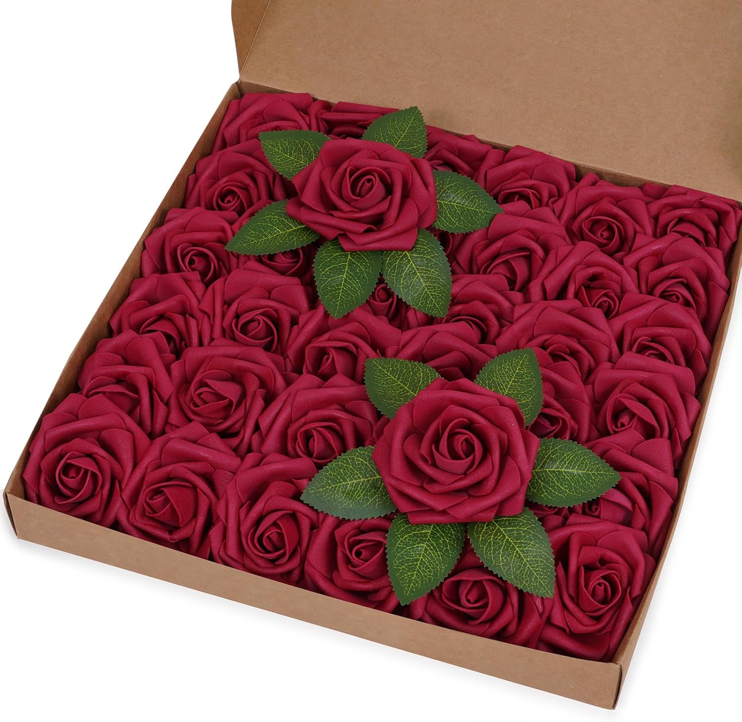 - Kindle Your Creative Flames: The box includes 36 burgundy roses (3" flower head, 8" stem) and 8 green rose leaves, perfect for an array of DIY crafts. Whether creating wedding bouquets, graduation or birthday party ornaments, baby shower decorations, or cake adornments, our faux roses add a touch of class to every important moment.