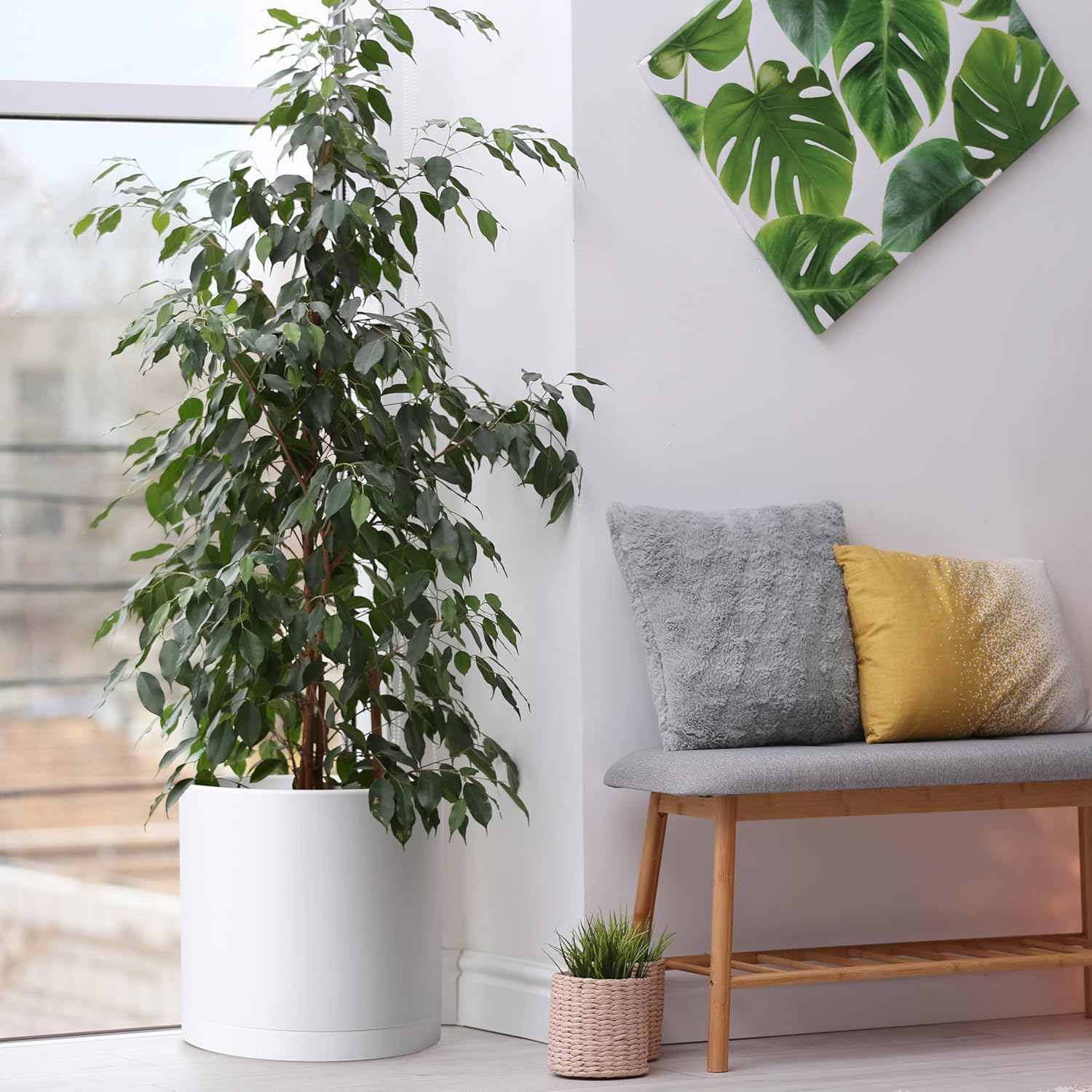 D'vine Dev 2 Pack 14 Inch Modern Plastic Plant Pots, Cylindrical Garden Planters for Plants with Drainage Holes and Saucers, White, 74-Z-Q-1