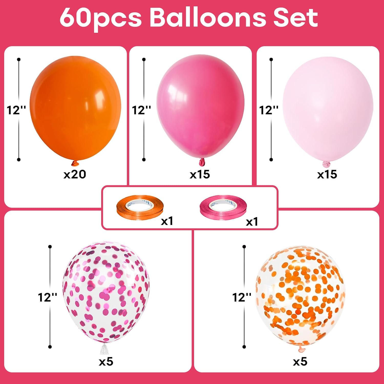 - π Orange Hot Pink Balloon Includes: You will get 60 pack pink and orange latex balloons, all sized 12 inch, including matte orange balloon (20 pcs), fuschia pink balloons (15 pcs), pastel pink balloons ( 15 pcs), orange confetti balloons (5 pcs), hot pink confetti balloon (5 pcs) . Orange balloon ribbon * 1 pc, pink balloon curling ribbon * 1 pc. With perfect size and classical collocation, globos rosados will increase lots of fun to the pink and orange party decorations!
