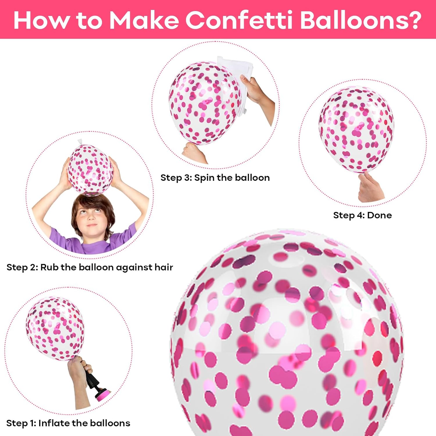 - π How to make Glitter Balloons Confetti: For your convenience, our pink glitter balloons are pre-filled with sparkly confetti. After blowing up the magenta confetti balloons, you can just rub the pink birthday balloons for girls on your hair, towel or something similar to help the confetti stick to the balloon easily. Create a romantic scene at your party as you pink sprinkle confetti balloons all over the place, then enjoy your happy time.
