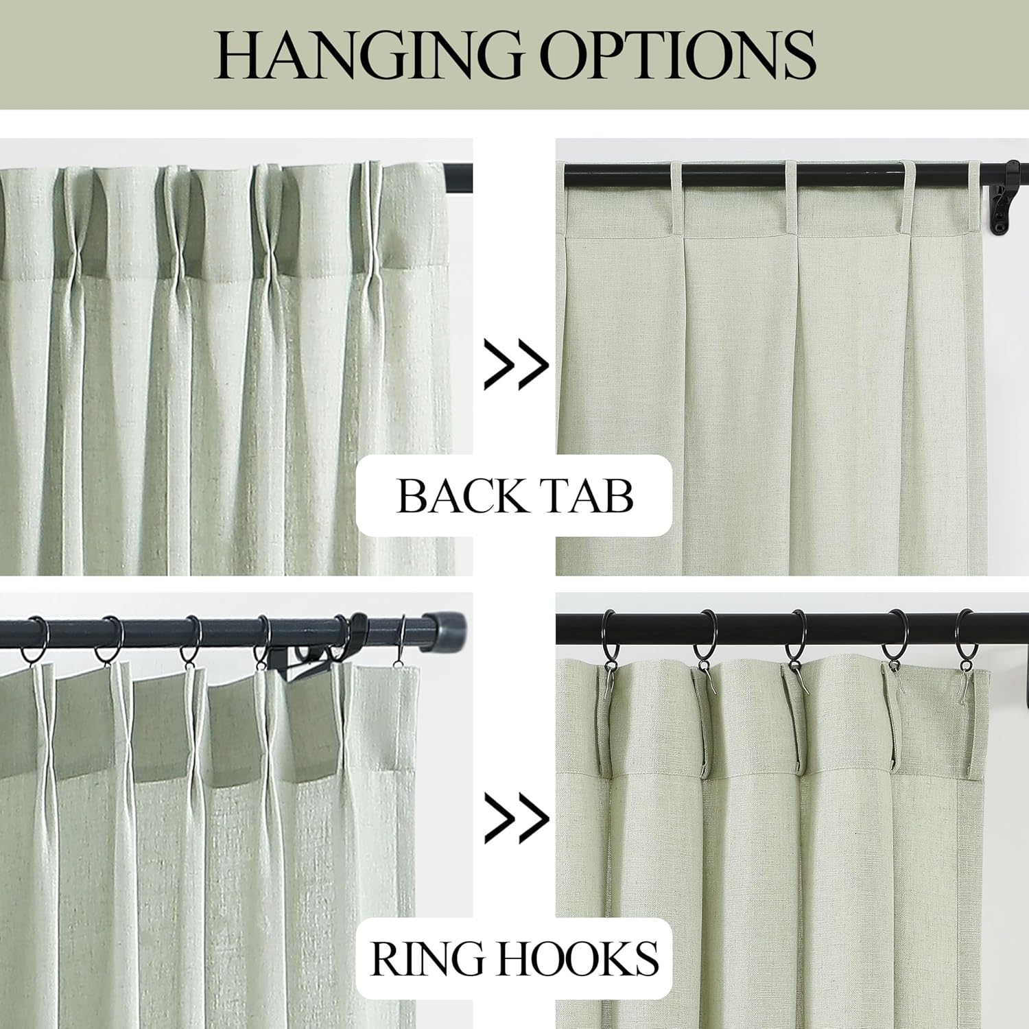 - Pinch Pleats Design:Each pale green curtain panel with 10 pinch pleats generates modern and luxury feel.Linen curtains provide a natural,and textured look that complements a variety of interior styles.By offering linen curtains in various colors,patterns,and lengths,we can cater to customers looking for a casual yet sophisticated window treatment.Hanging these pinch pleat curtains to elevate your windows and increase the aesthetic value to any spaces,bedroom,living room,nursery,office,etc.