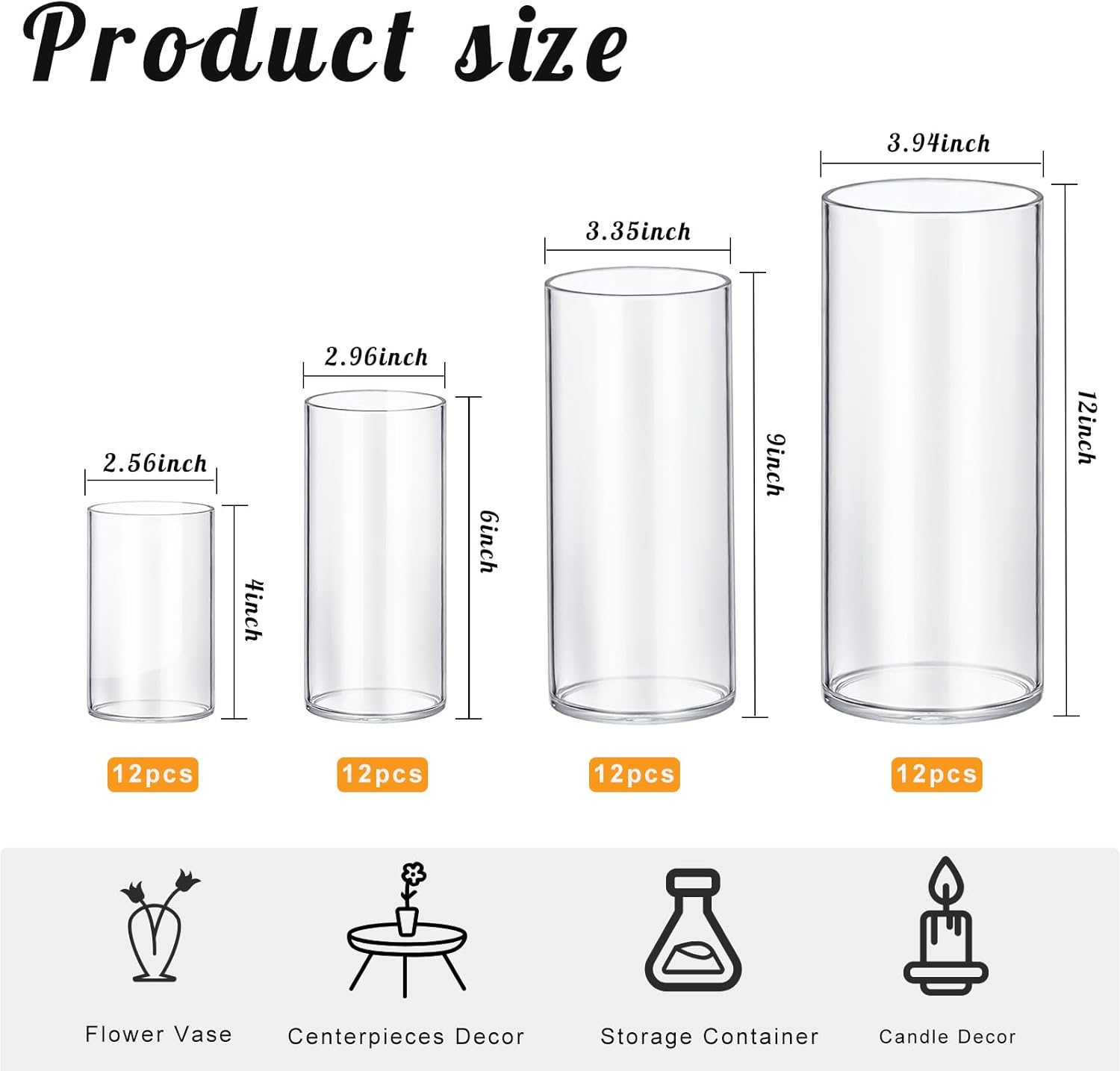 - 【Package Including】: The cylinder vase set contains 48 pack clear candle vases , the height is about 4,6,9,12 inch, each size 12 pcs and the diameter is about 2.56, 2.96, 3.35, 3.94 inch, it can be meet your different needs , such as: flower arrangement, candle holders, home decor, wedding