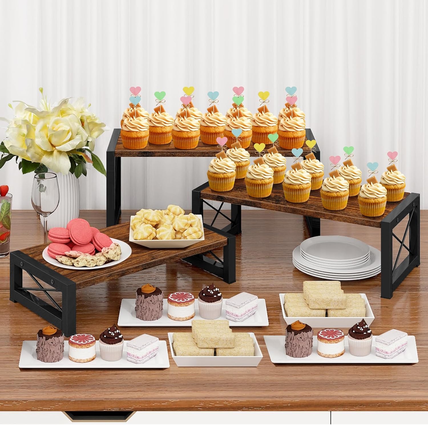 - 【Risers Display Stands】Use it to embrace the rustic charm and create a warm, inviting atmosphere that complements your events. This large 3 tier display stand can be used not only to hold and display your cakes, pastries, desserts, cupcakes, cookies and fruits, and scented candles but also small sculptures, small lights, small plants, pottery, etc. The unique design makes it perfect for dessert tables, parties, or retail displays.