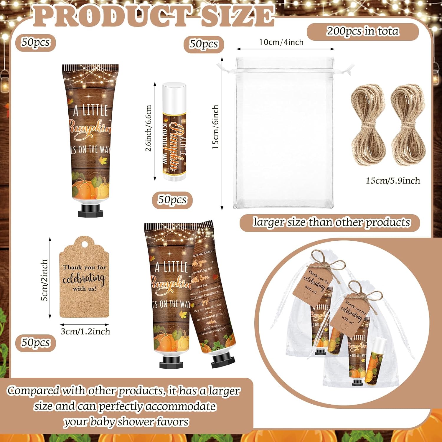 - Pumpkin Baby Shower Guest Gifts: whether for a baby shower party, birthday, wedding, anniversary or simply as a treat for yourself, the package includes 50 each of pumpkin theme hand lotions, lip balms, organza bags, kraft paper tags with hemp ropes that add a splash of elegance to your gift setting