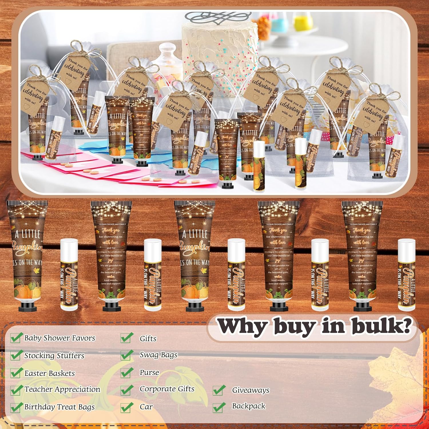 50 Sets 200 Pcs Baby Shower Hand Lotion and Lip Balm Gift Theme Baby Shower Party Favors Travel Size Hand Lotion and Lip Balm Bulk with Organza Bags Tags(Rustic Pumpkin)