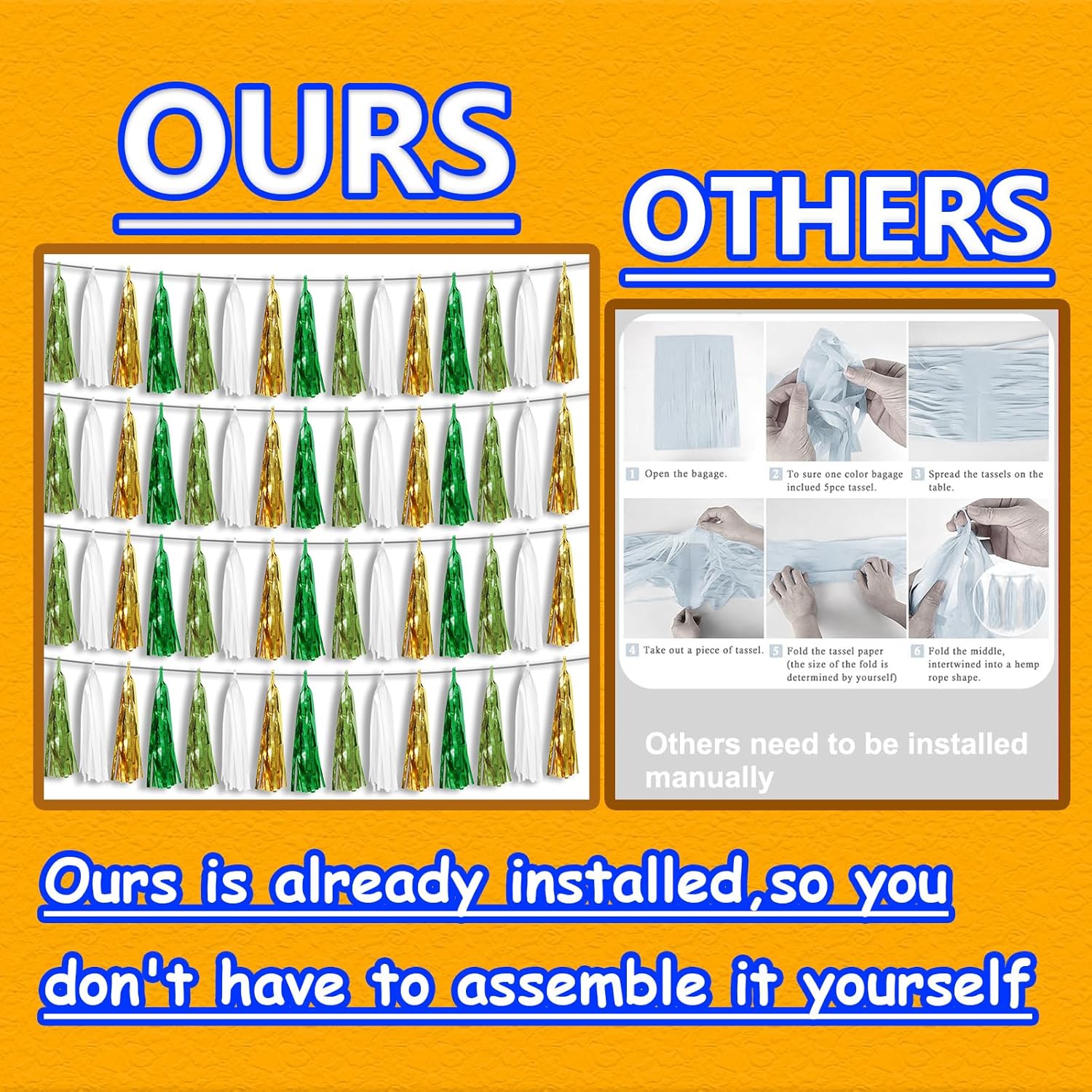 - 【Package Includes】The total length of the green gold birthday tassels banner is 40 feet, divided into 4 strips, each 10 feet long. Each banner contains 15 tassels, and each tassel measures 14 inches, for birthday decorations many occasions uitable for Patriotic display, Homecoming Float, Christmas Float, ecorative metal trailers, graduation floats etc