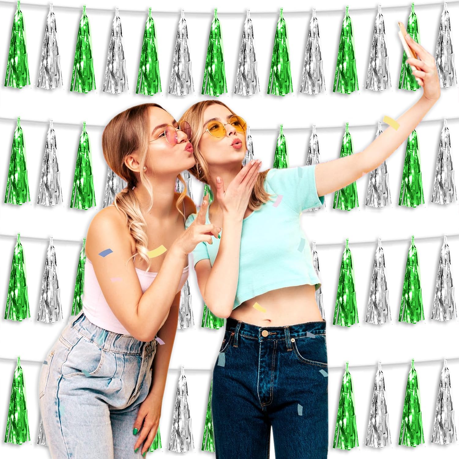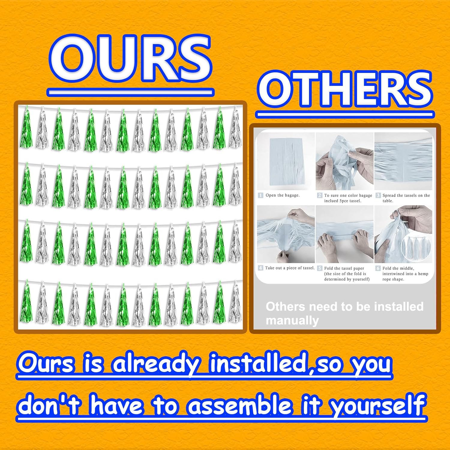 - 【Package Includes】The total length of the green silver birthday tassels banner is 40 feet, divided into 4 strips, each 10 feet long. Each banner contains 15 tassels, and each tassel measures 14 inches, for birthday decorations many occasions uitable for Patriotic display, Homecoming Float, Christmas Float, ecorative metal trailers, graduation floats etc