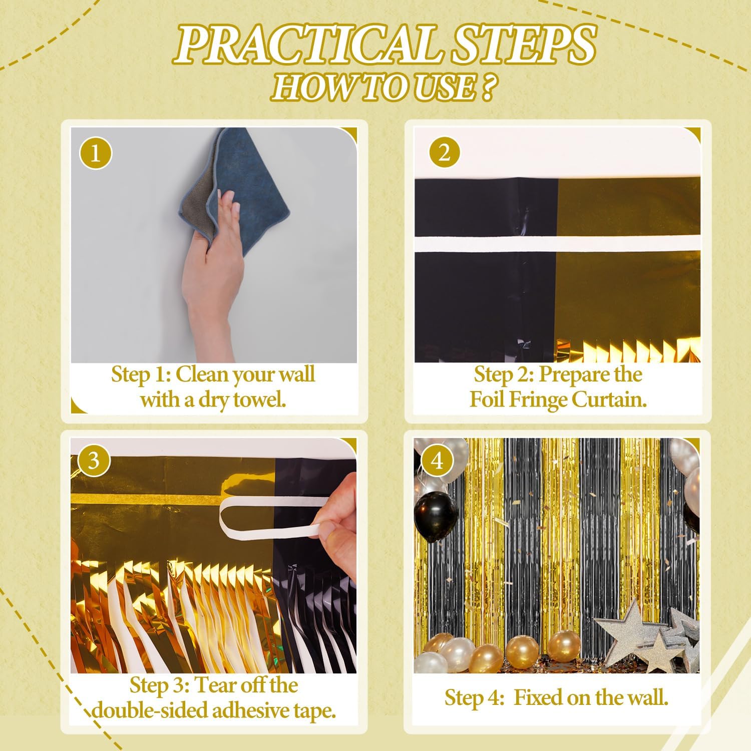 - 【Easy and Convenient Installation】These foil fringe curtains are easy to install and can be quickly hung on smooth surfaces using the included double-sided adhesive tape. No extra tools or materials required.