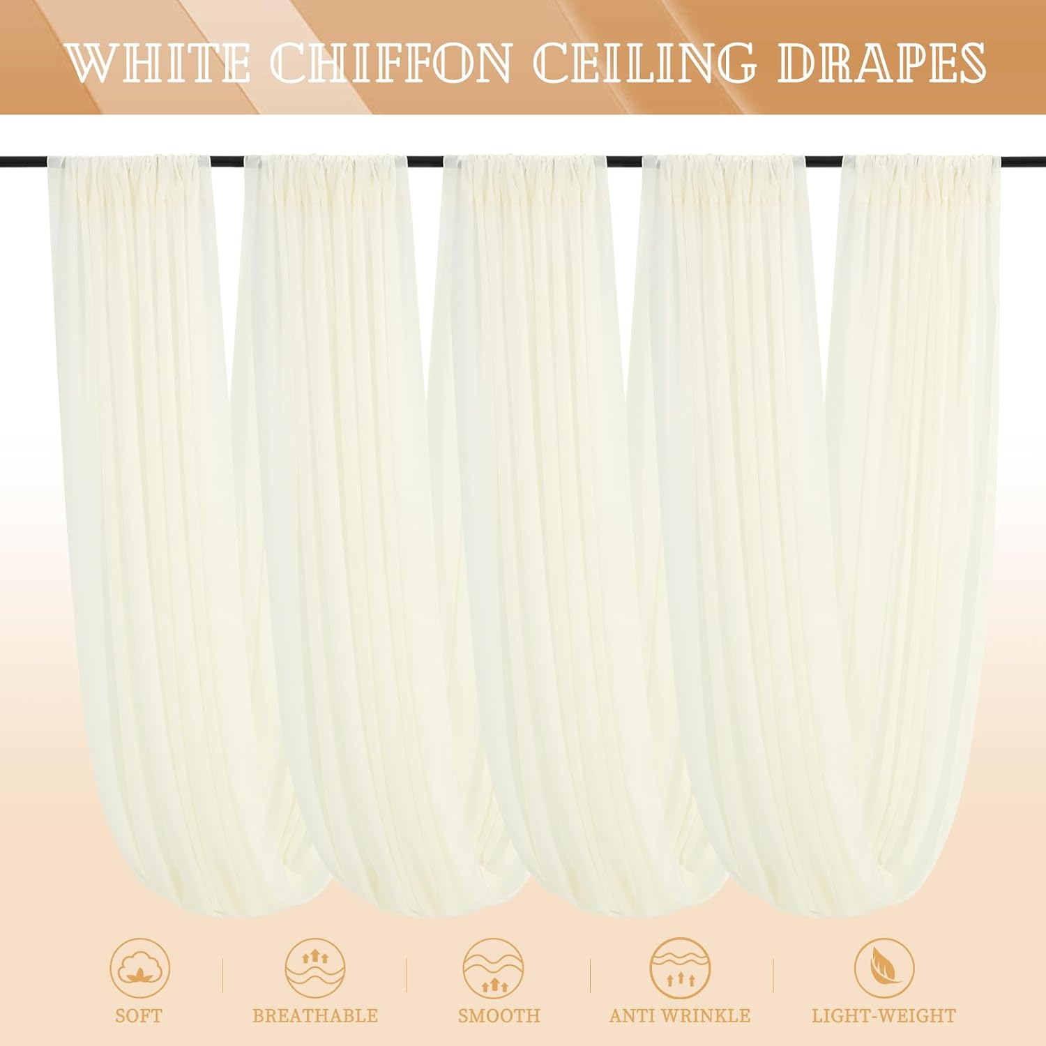- 【Soft Sheer Material】Long wedding drapes is made of soft touch chiffon fabric. All edges are finished with firm and exquisite stitching, airy and light-weighted. Wrinkle-free, easy draping or hanging straight, good vertical sense and durable. These backdrop curtains will help to create a great eye catching detail in your wedding ceiling decoration.
