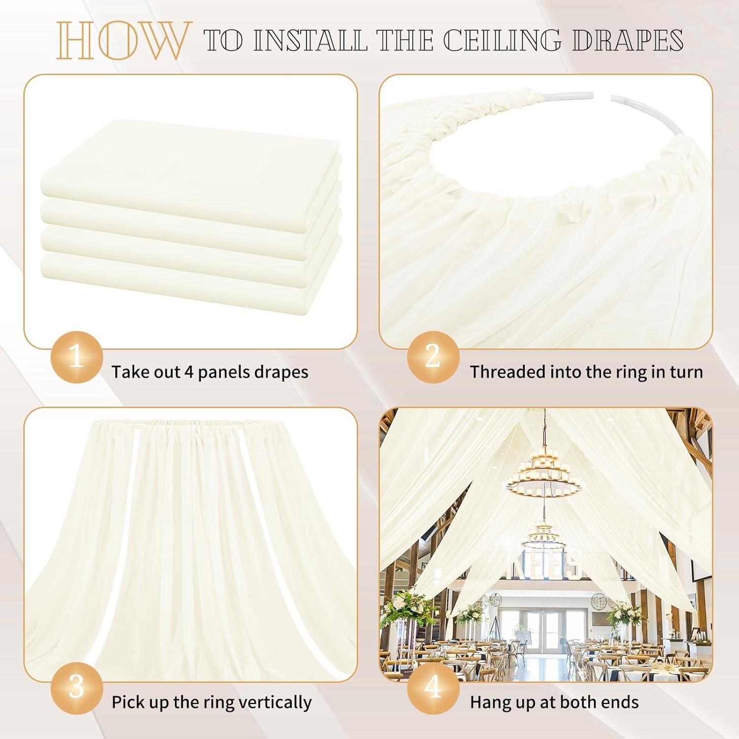 - 【Ivory Ceiling Curtain Easy to Install】There is a 4 inches pocket for rod or pole entry at the top and bottom of each panel creating beautiful draping. Entry at the top and bottom of each panel creating beautiful and natural draping. Sheer arch draping fabric are good choice to decorate your party and event. Different hanging methods will bring you various visual effects.