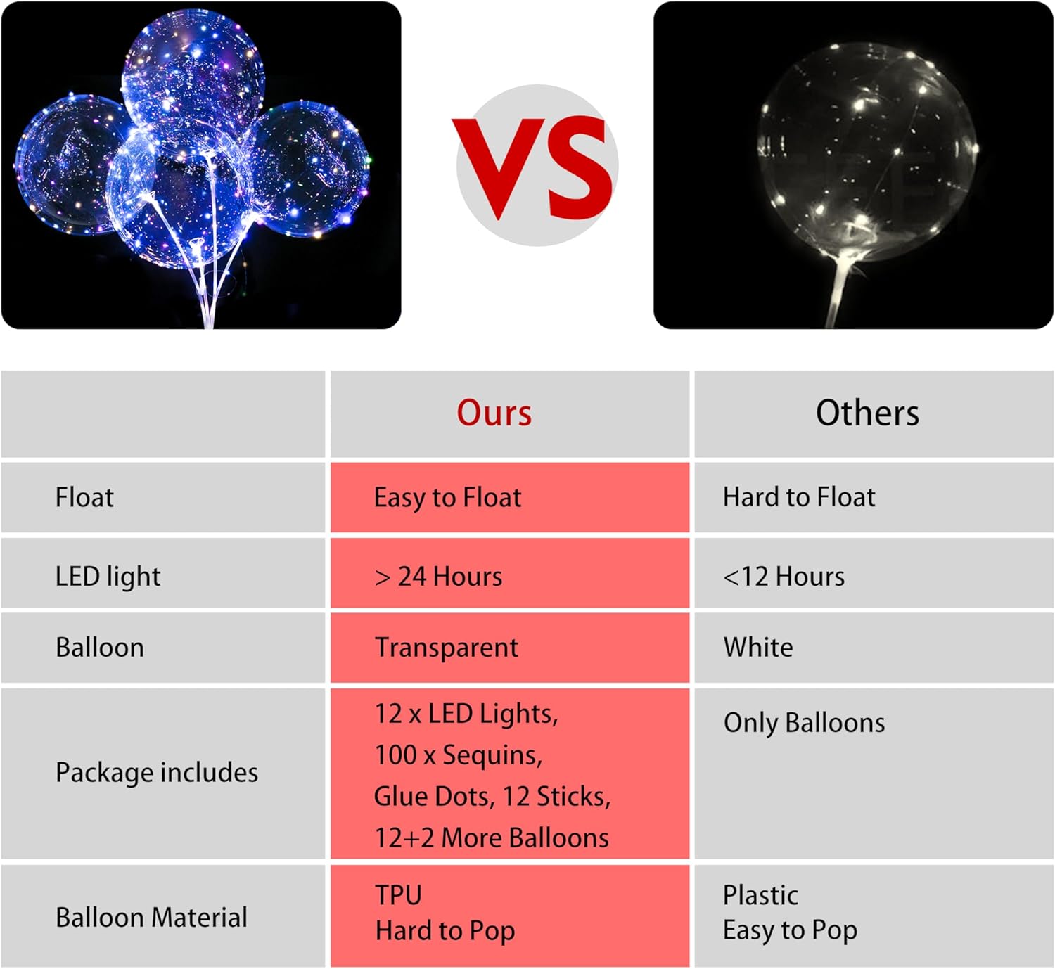 - HIGH QUALITY - Our clear balloons with lights are made of high quality TPU. It's easy to pump up and light weight. Pumped with helium, light balloons can float even wrapped with LED strings. LED lights last for more than 24 hours and balloon holds helium for more than 3 days