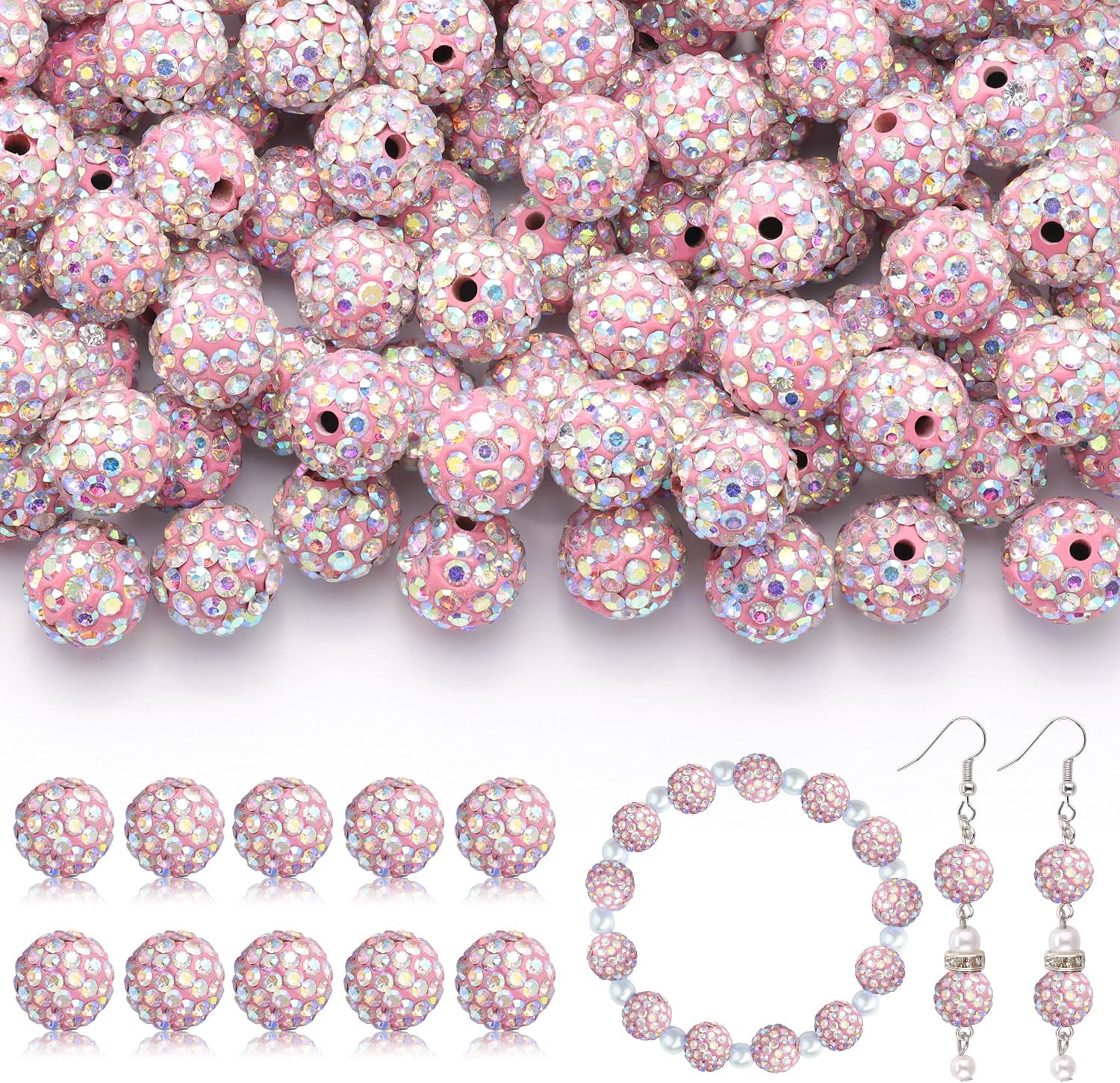 200pcs 10mm Rhinestone Beads for Jewelry Making, Pink AB Shiny Round Disco Ball Beads Bulk, Sparkle Crystal Clay Christmas for Bracelet Baseball Necklace Earring Crafting and DIY