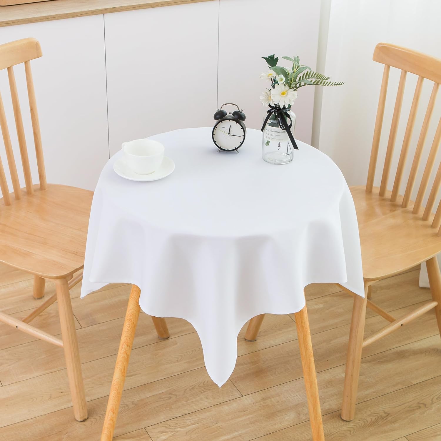 - Size Guide: Each package contains 2 PCS tablecloths. Each small square white tablecloth is 36X36 inches, recommended for small square tables from 20 X 20 inches to 28 X 28 inches, such as end tables, coffee tables, tea tables, beside tables, foldable tables, nightstands, flower stands and so on, with a droop length about 4 inches to 8 inches. There may be a slight deviation due to manual tailoring