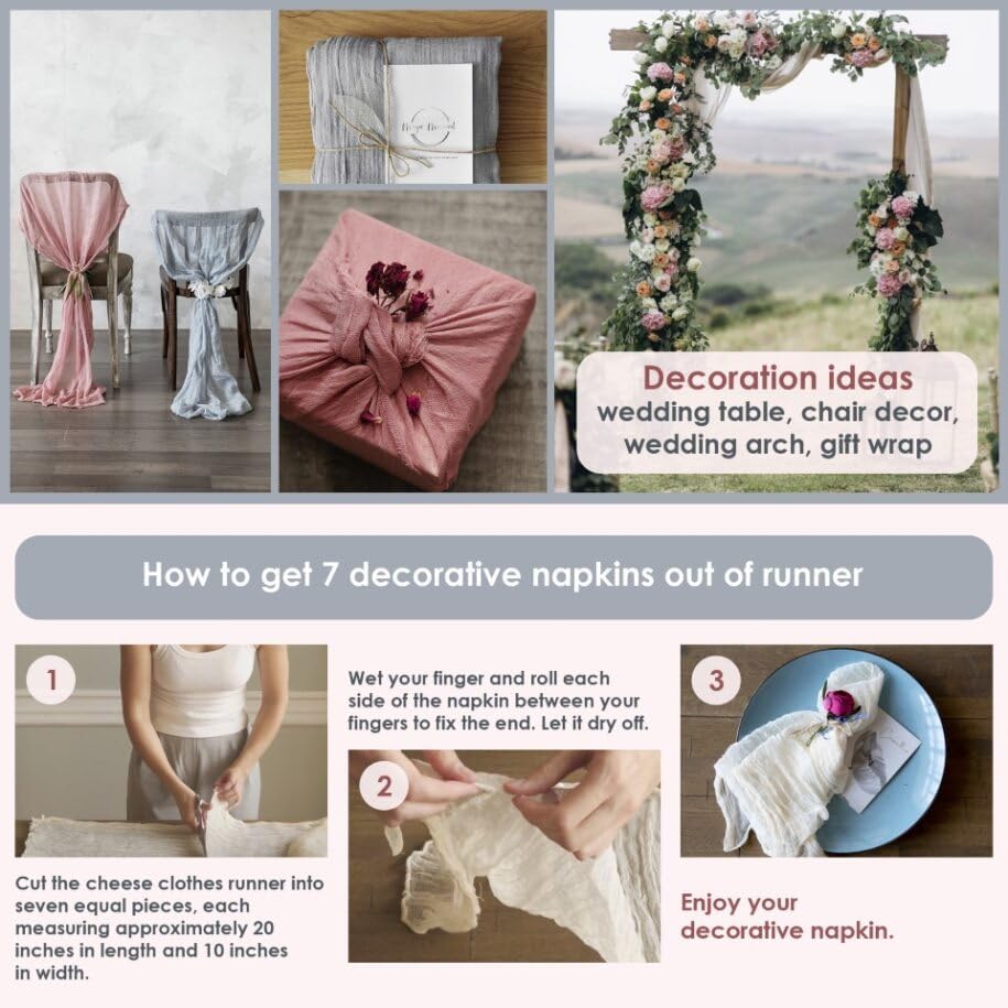 - Occasions to apply. Our cheese cloth table runner is a versatile piece that can be used for various occasions such as weddings, baby showers, bridal showers, and birthdays.