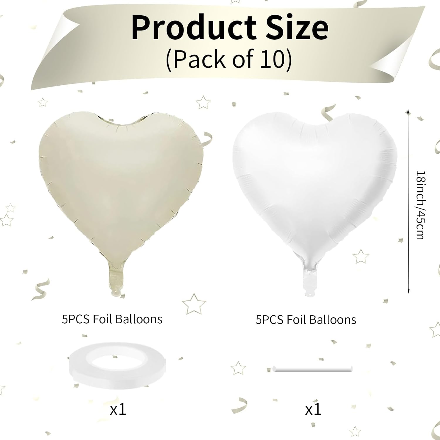 - 10 PCS Cream Heart Balloons: Our package contains 5 x 18 inches cream heart shaped balloons, 5 x 18 inches white heart shaped balloons, 1 x 10m ribbon. The cream foil heart balloons are specially designed to add a touch of fun and surprise to any party or holiday celebration. With a size of 18 inches, they are the perfect addition to your decorating needs, leaving your guests with an unforgettable smile!