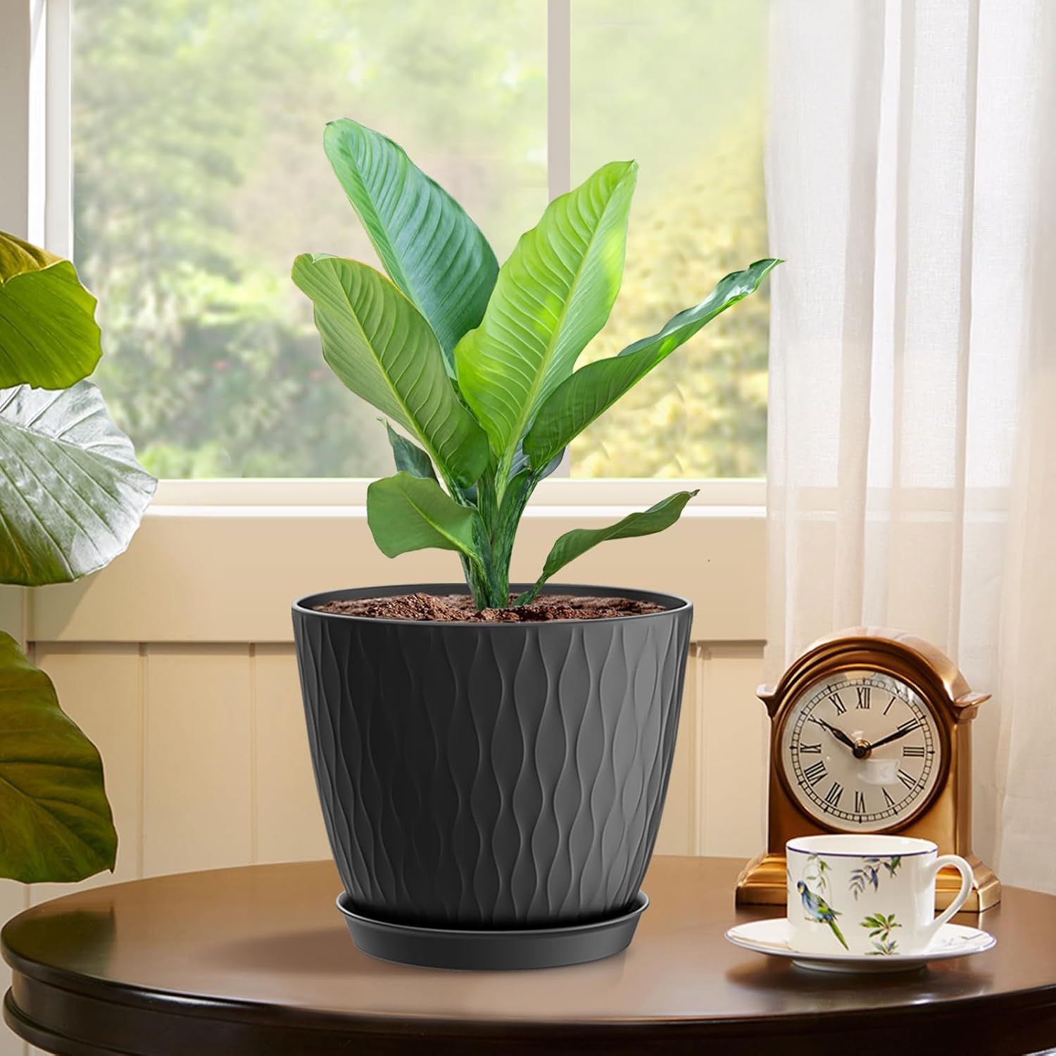 6 inch Plant Pots, 5 Pack Flower Pots with Drainage Holes and Saucers for Indoor Plants, Plastic Planters with Water Ripple for Small Garden House Plants, Nursery Pots for Succulent, Black