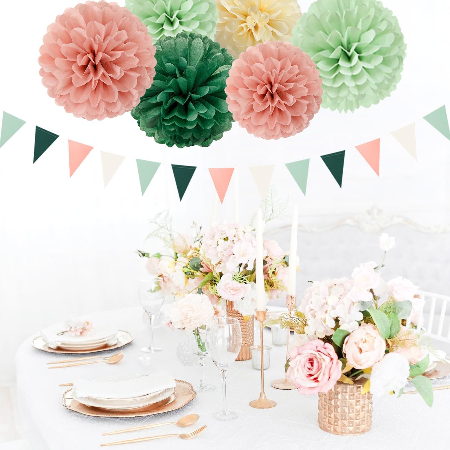 - 【Sage-Olive Green Pink Beige Party Kits】The party decorations kits include 8pcs tissue paper flowers: 4pcs 8" and 4pcs 10" in sage green,olive green,pink beige color, 1pcs Triangle Flags,1pcs circle dots paper garland,15pcs tassel garland. Total 23pcs.