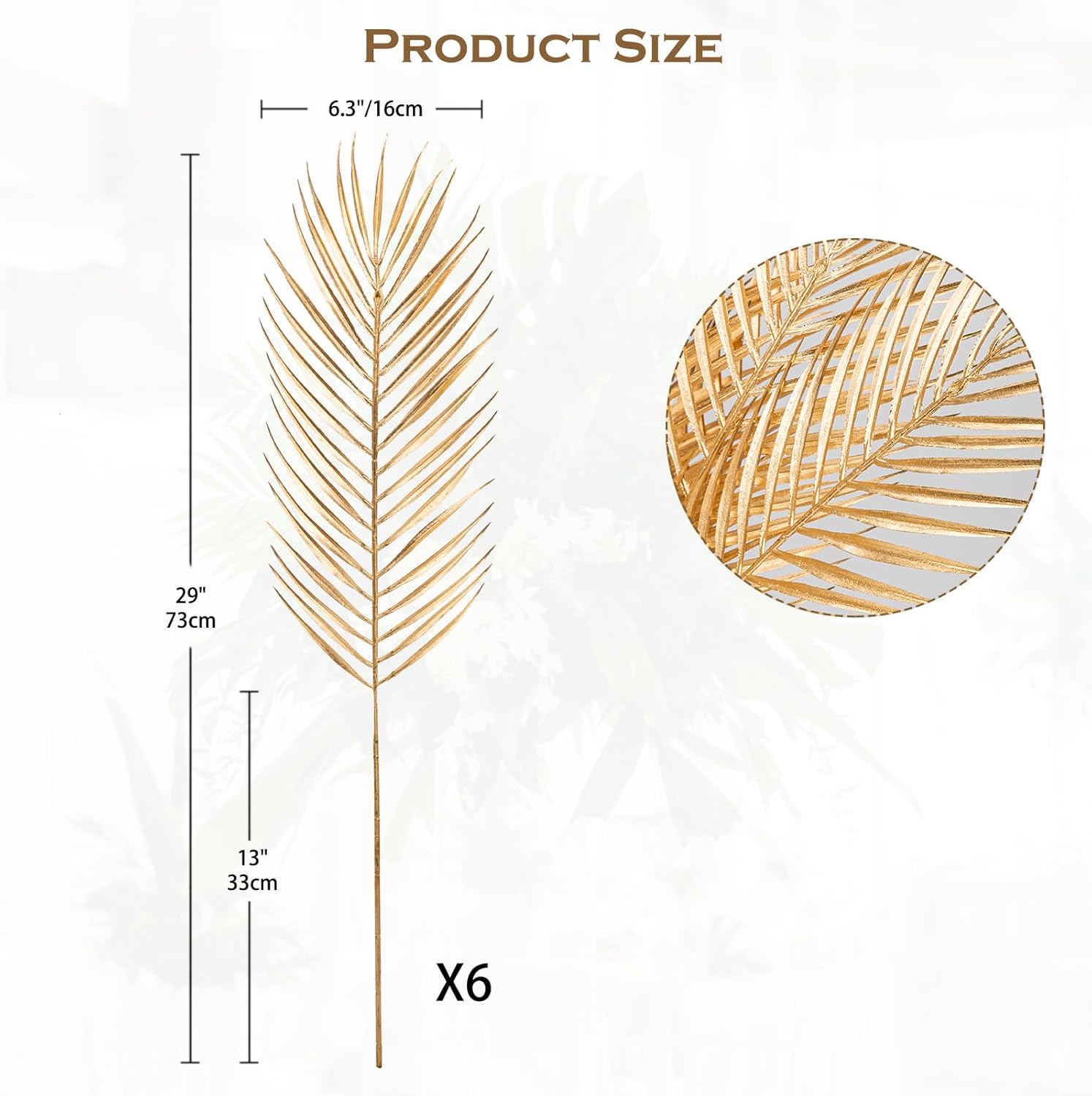 - Premium Material- Artificial gold palm leaf made of durable fabric, the surface of the leaves is glossy and the veins are clearly printed, Bendable palm stem to fit your vase or adjust the shape make it looks more real.