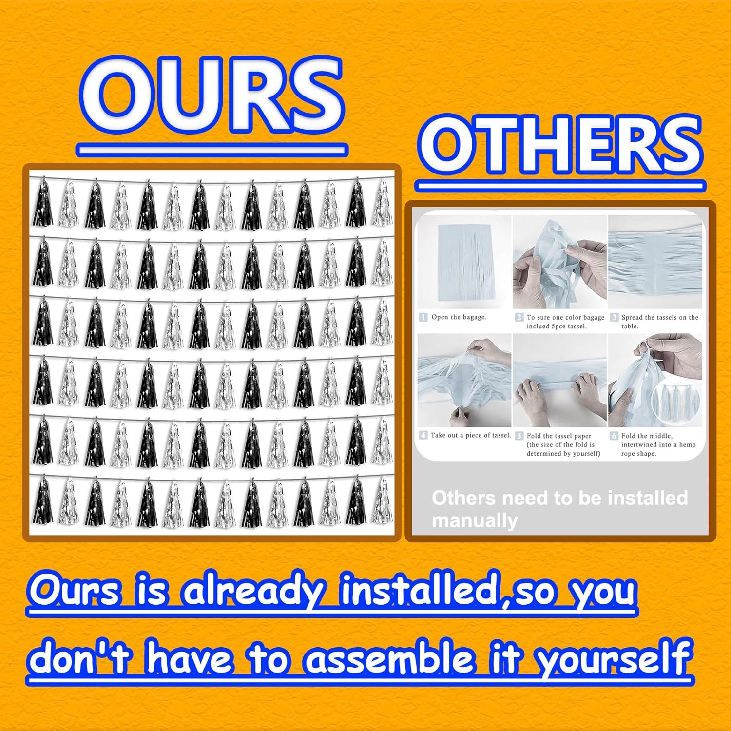 - 【Black Silver Beige Mint Gold Party Supplies Set】: The total length of the Black Silver beige mint gold birthday tassels banner is 39.4 feet, divided into 6 strips, each 9.8 feet long. Each banner contains 15 tassels, and each tassel measures 14 inches, for birthday decorations many occasions, and so on