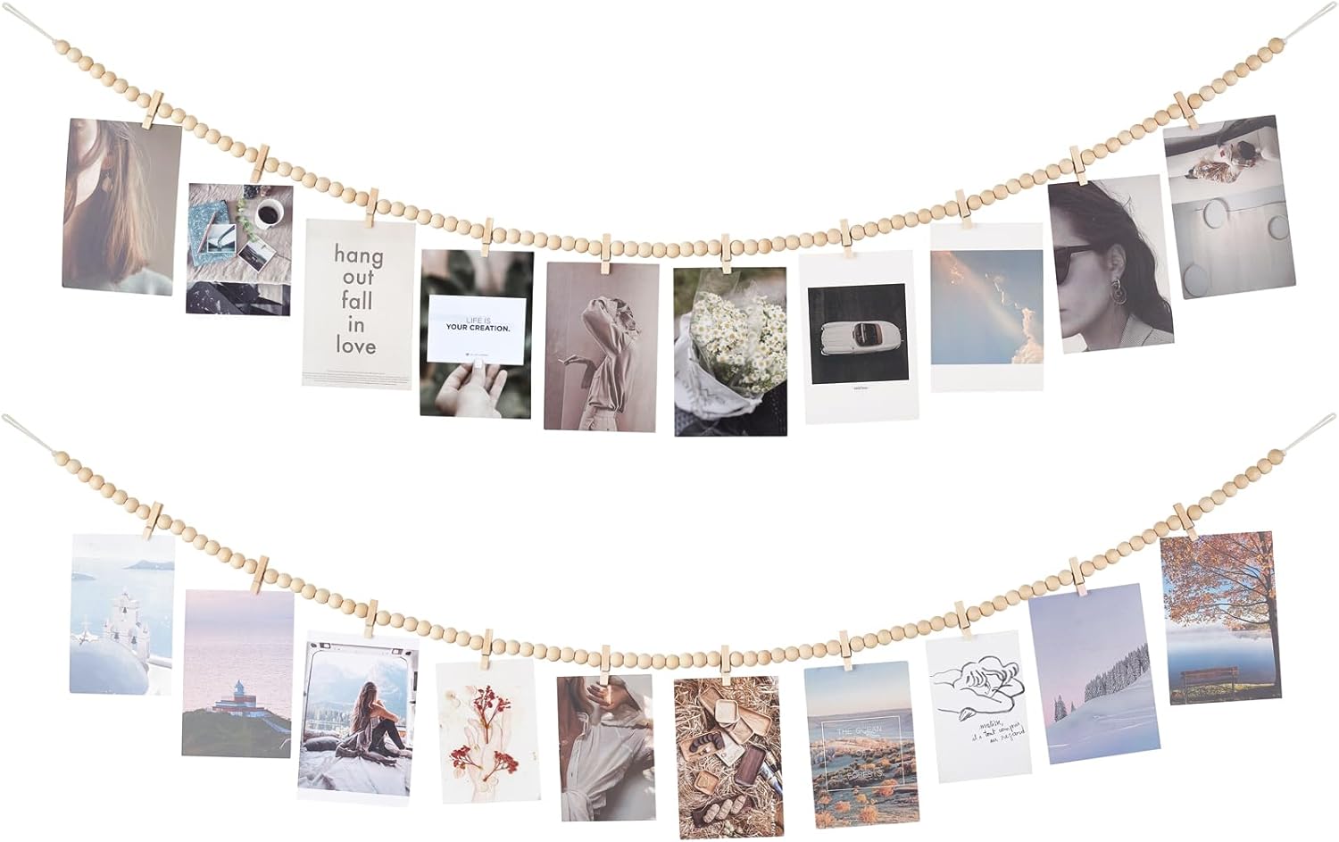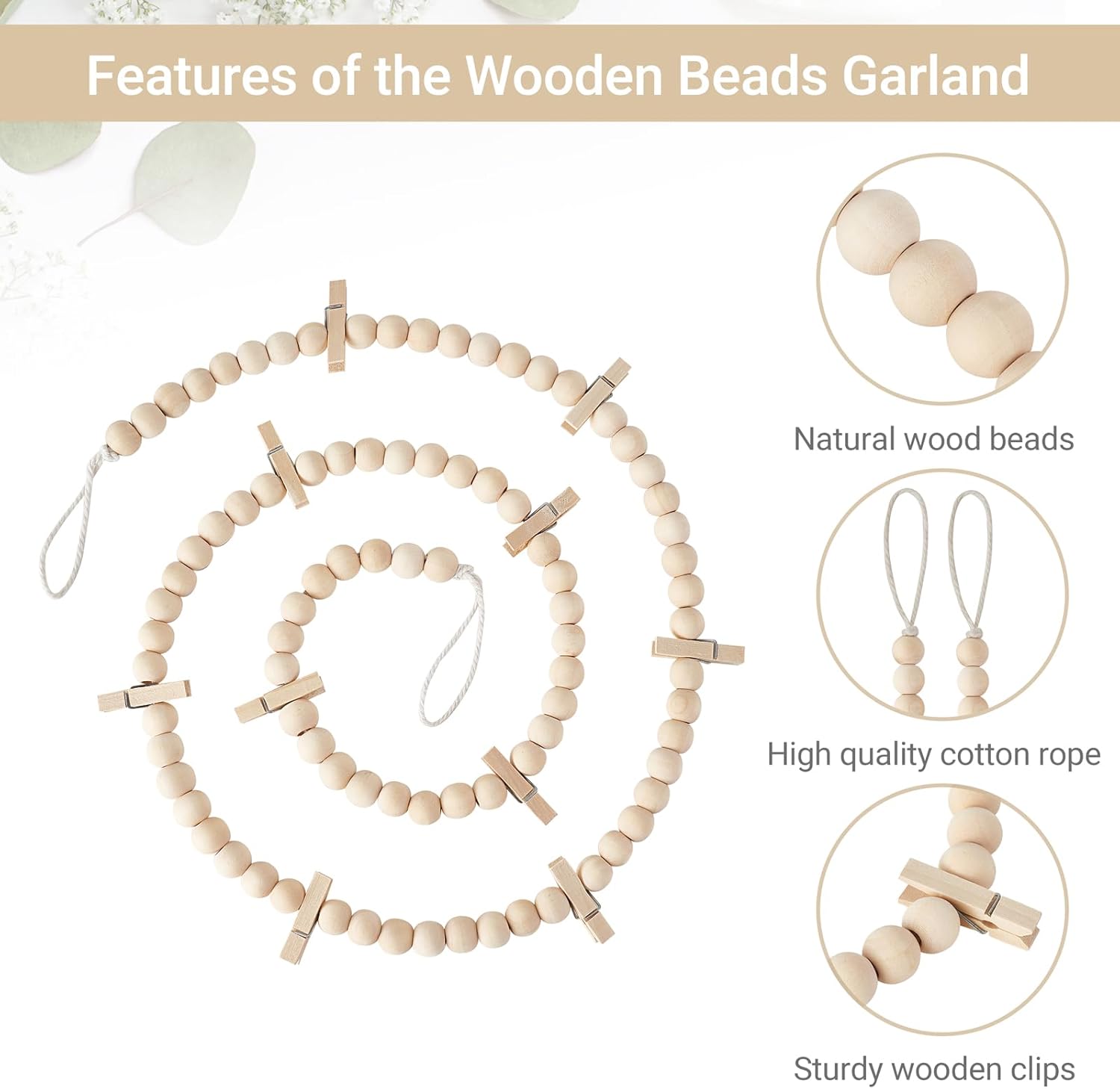 - Size and Package: The total length of the whole garland is 51.2 inches, with a wood bead chain length of 47 inches. Each garland includes 10 clips, with 8 wooden beads spaced between each wooden clip. This set includes 2 pieces, catering to your various needs for picture display and home decor. Note: This is a handmade item, the length of the garland may has 1-2 inches deviation.