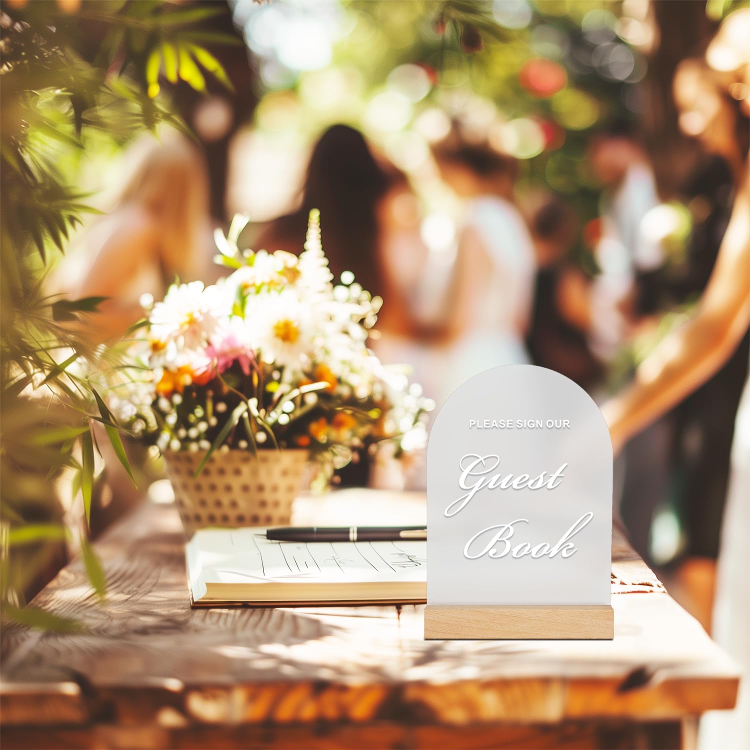 - Premium Materials: Our acrylic wedding sign features 1/8-inch thick frosted acrylic, ensuring durability. It includes a 5x7 inch guest book table sign, a cards and gifts table sign, a Favors sign, an In Loving Memory sign, and 4 sturdy wood stands made from German beech wood, ensuring stable support and durability. The white text is UV printed, ensuring clarity and durability. Ideal for use as both wedding decor and keepsakes, they can be reused for future events.