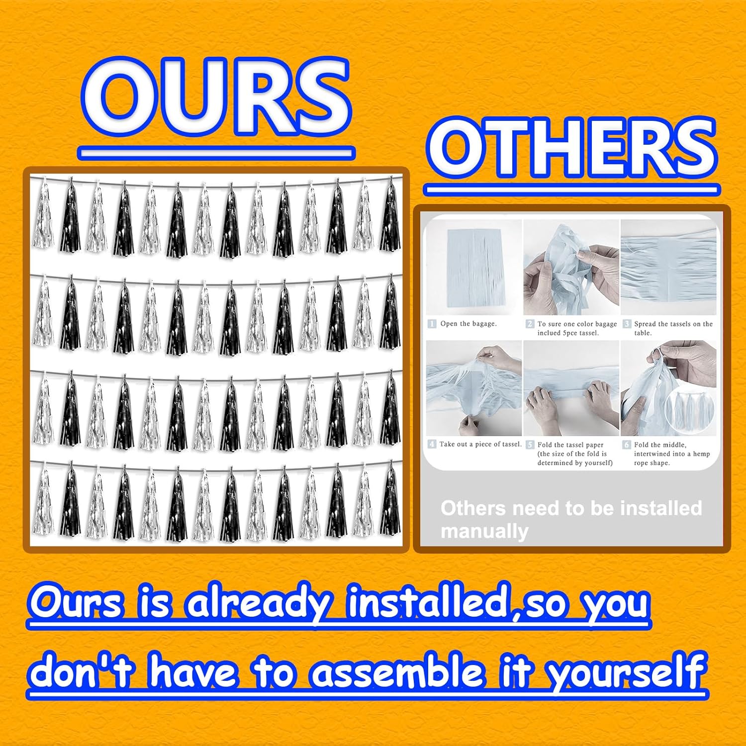 4P Black Silver Foil Fringe Metallic Tassel Streamers Banner Tassel Garland for Parade Floats, Graduation, Wedding, Birthday, Halloween, Christmas, Bridal/Baby Shower Party Decorations