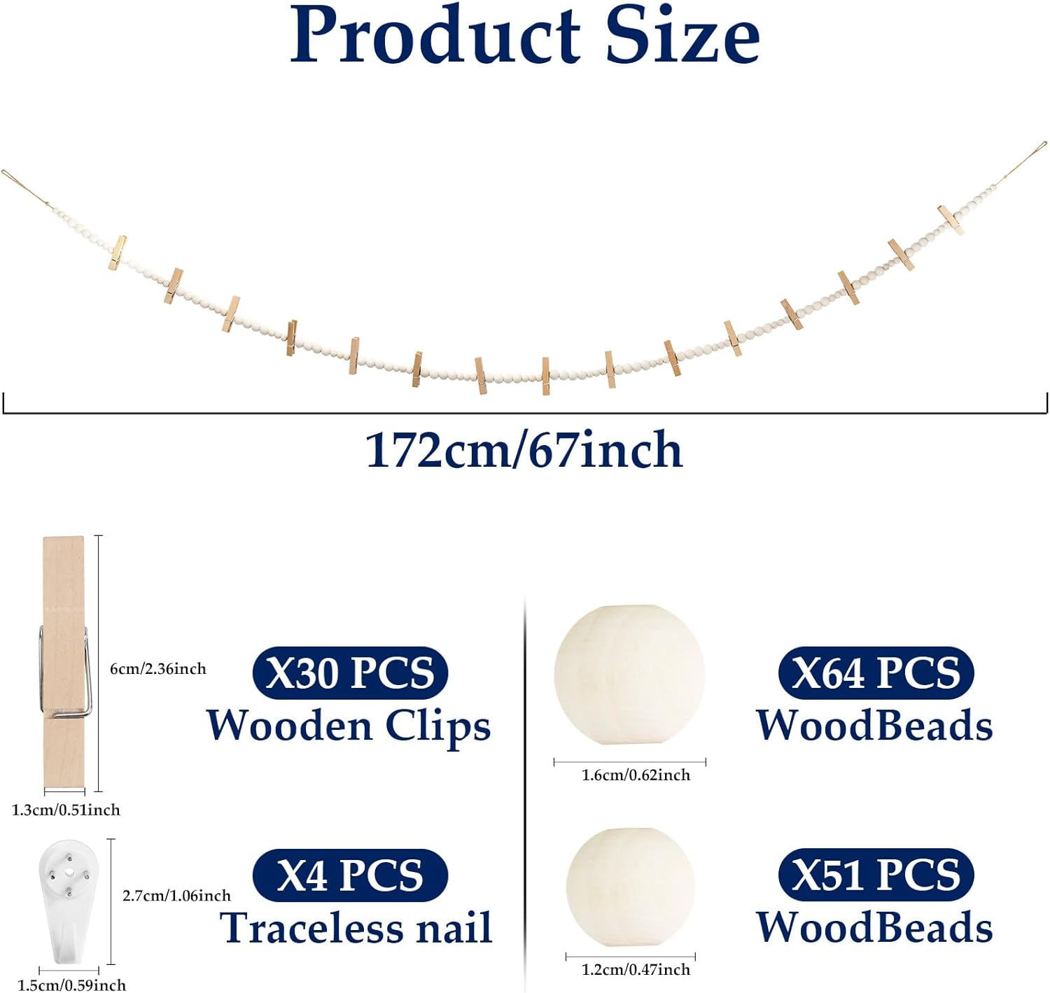 - 2 Pcs Boho Wood Beads Garland Size: The total length of the photo wall display is 67 inches. It features wooden beads of different sizes, with bead diameters of 0.47 inches and 0.63 inches, totaling 80 wooden beads. It is long enough to fit any home decor and makes a lovely addition to walls, shelves, beside mirrors, over fireplaces and sofas,and more.