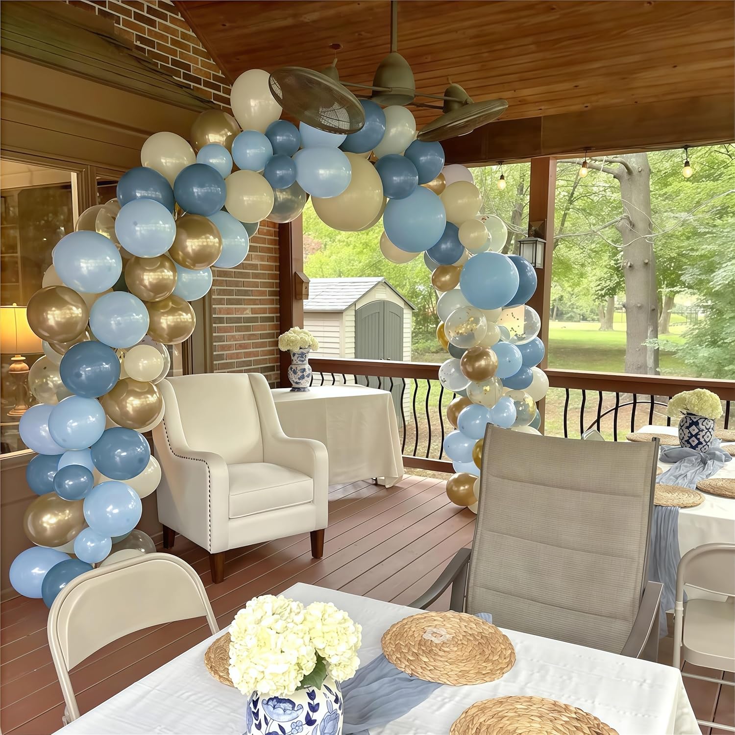 - π Dusty Blue Balloons Set: This is a beautiful bright balloon, which contains balloons of different colors. Include 12 inch white sand balloon(15pcs), dusty blue balloon(15pcs), Slate Baby Blue balloon(15pcs), metallic champagne gold balloon(10pcs), gold confetti balloon(5pcs), 2 rolls of ribbons. You can use these different shades of blue balloon kits, DIY balloon combinations to create your birthday party.