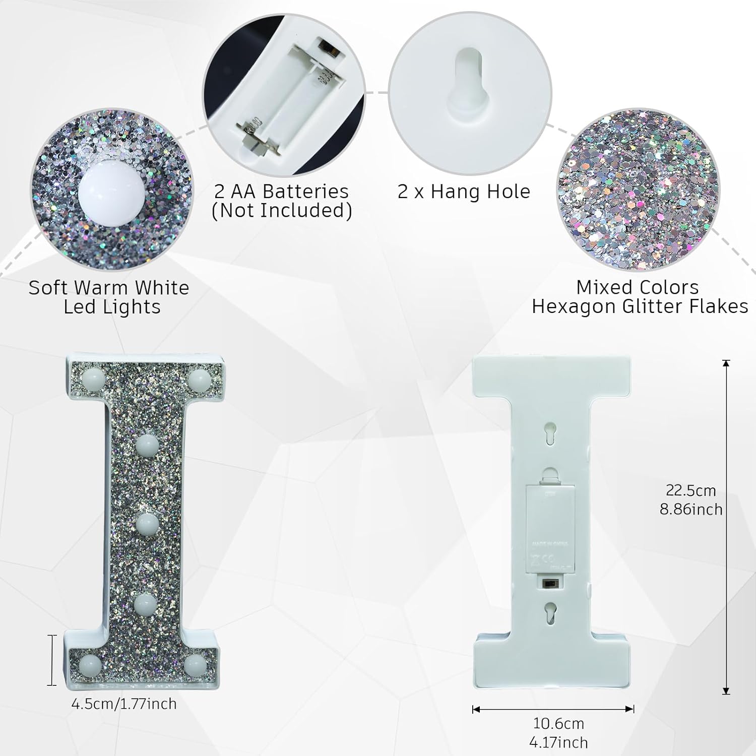 - ๐ก Elegant Glitter Light-Up Letters with Silver Diamond Finish: These LED marquee light up letters feature a stunning glitter effect combined with a sophisticated silver diamond surface. Including all 26 alphabet letters and 10 numbers, these light up letters bring sparkle and elegance to any space, making them the perfect light letters for party decor, especially as light up letters for table settings or wall accents.