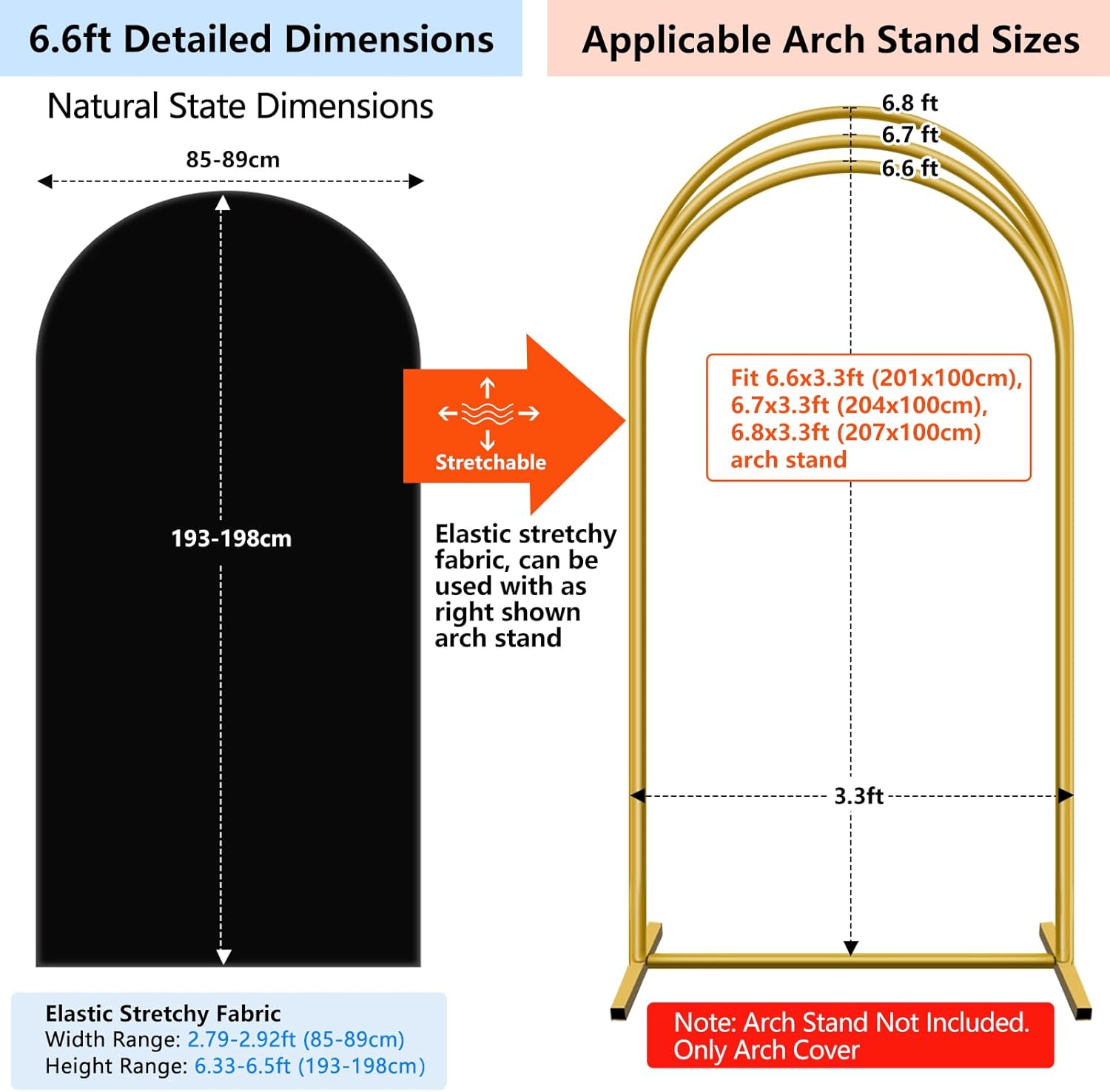 - Applicable Arch Stand Size: The arch cover has good elasticity, and the natural size range is 6.33-6.5 ft high and 2.79-2.92 ft wide. It can be used for arches with a height of 6.6 ft to 6.8 ft and a width of 3.3 ft. ⚠️ Note: Arch stand is not included