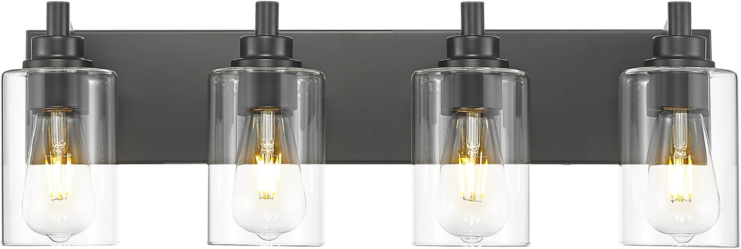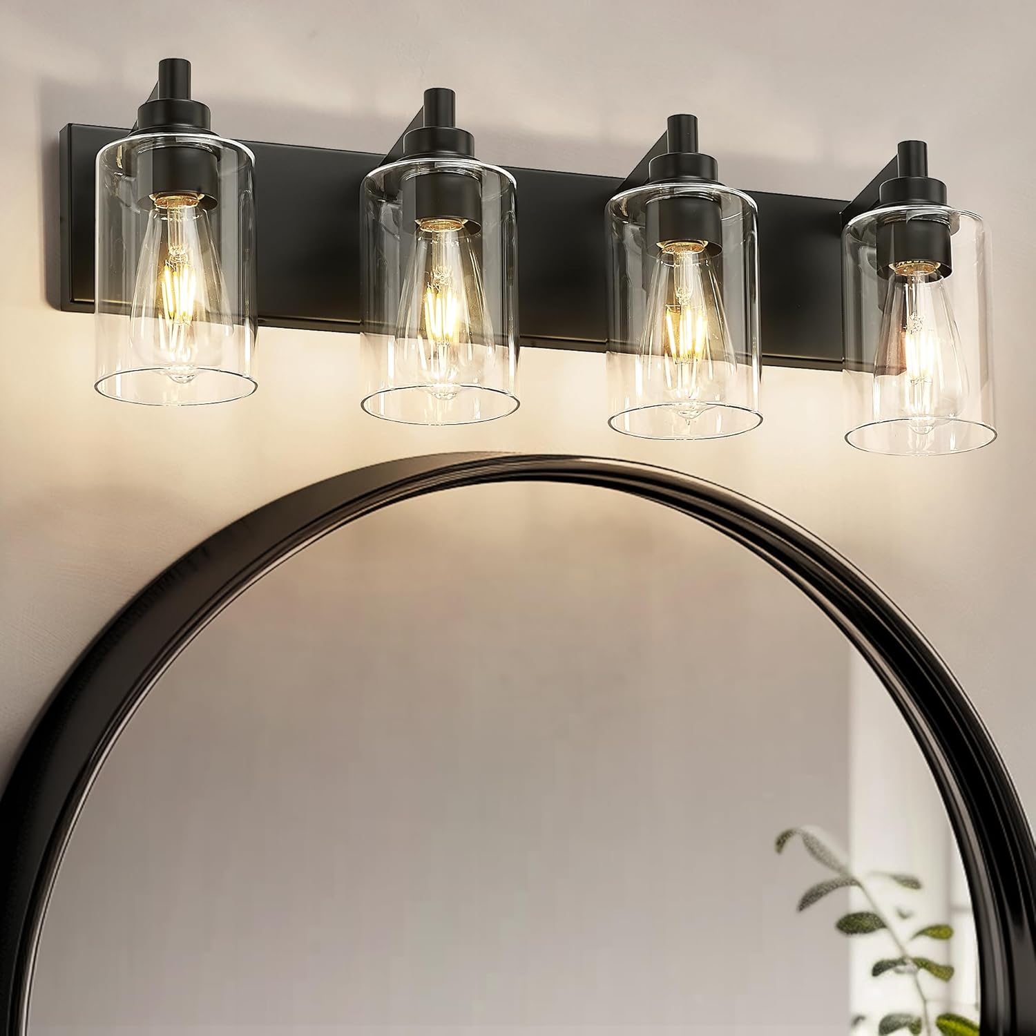 - Inspired Design: This 4-light bathroom light fixtures over mirror features a matte black metal frame and elegant cylinder clear glass shades, seamlessly fitting modern minimalist decor. You can install it upwards or downwards for versatile style
