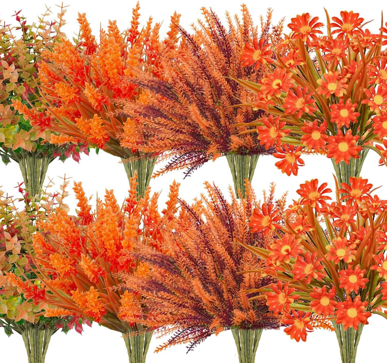 - Fall Beauty Combo: Pack of 64pcs, including 16 pcs fall orange daisy, 16 pcs fall eucalyptus stems, 16pcs fall artificial lavender, and 16pcs fall lavender stems. Various sizes and styles of fall plants