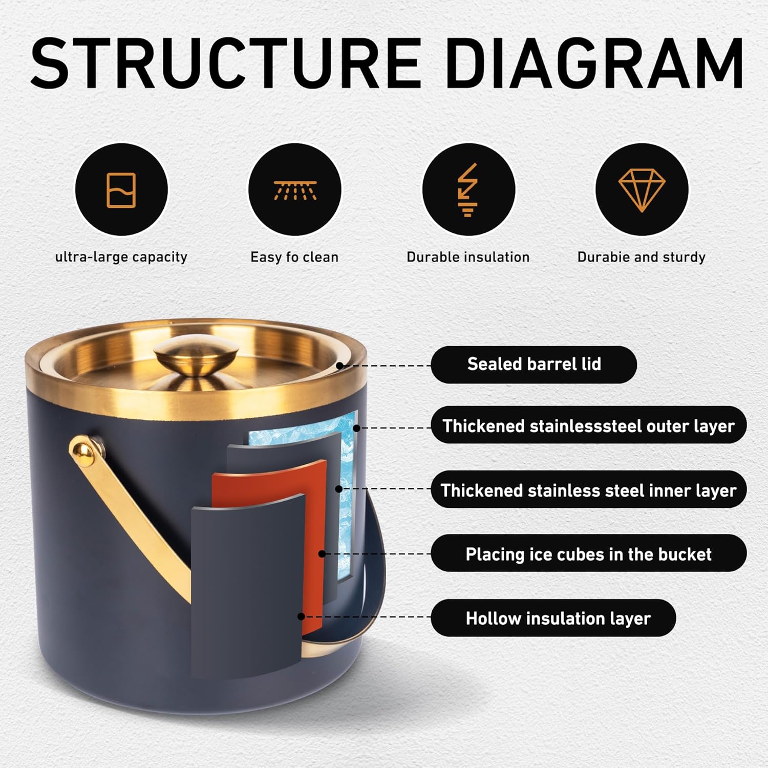 - 3. With a three-layer vacuum insulation and thickened stainless steel structure, this ice bucket features exclusive technology for faster and more lasting chilling effects, ensuring a safer usage experience. It includes an ice drain and an ice scoop for convenient ice handling. The design is smooth and refined.