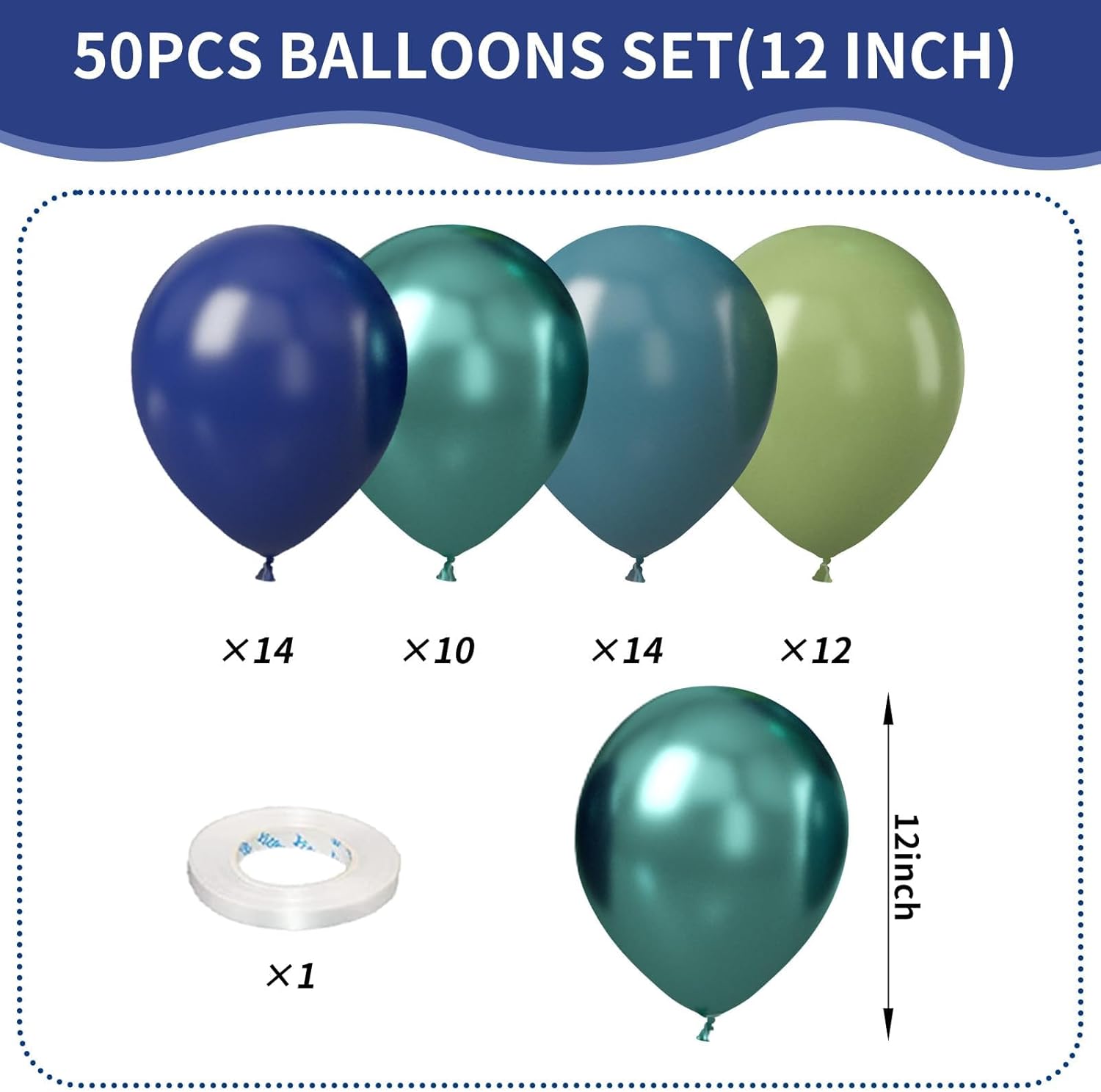 - Blue And Green Balloons: Package comes with 12 inch dark green balloons(12 pcs), navy blue balloons (14 pcs),light blue balloons(14 pcs),green metallic balloons (10 pcs),white balloon ribbon (2 rolls). Whether you're celebrating a birthday, party, or any special event, these balloons will add a festive and joyful touch.