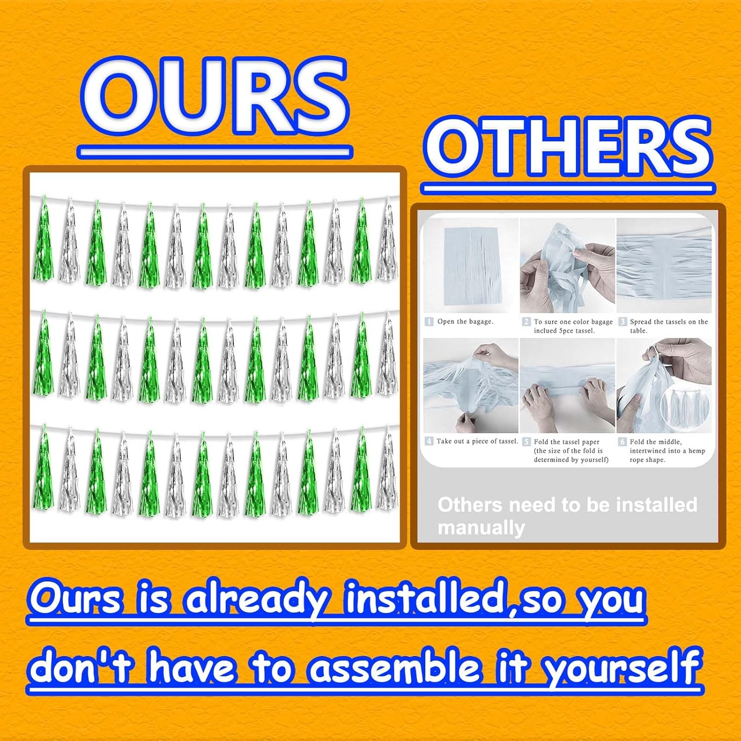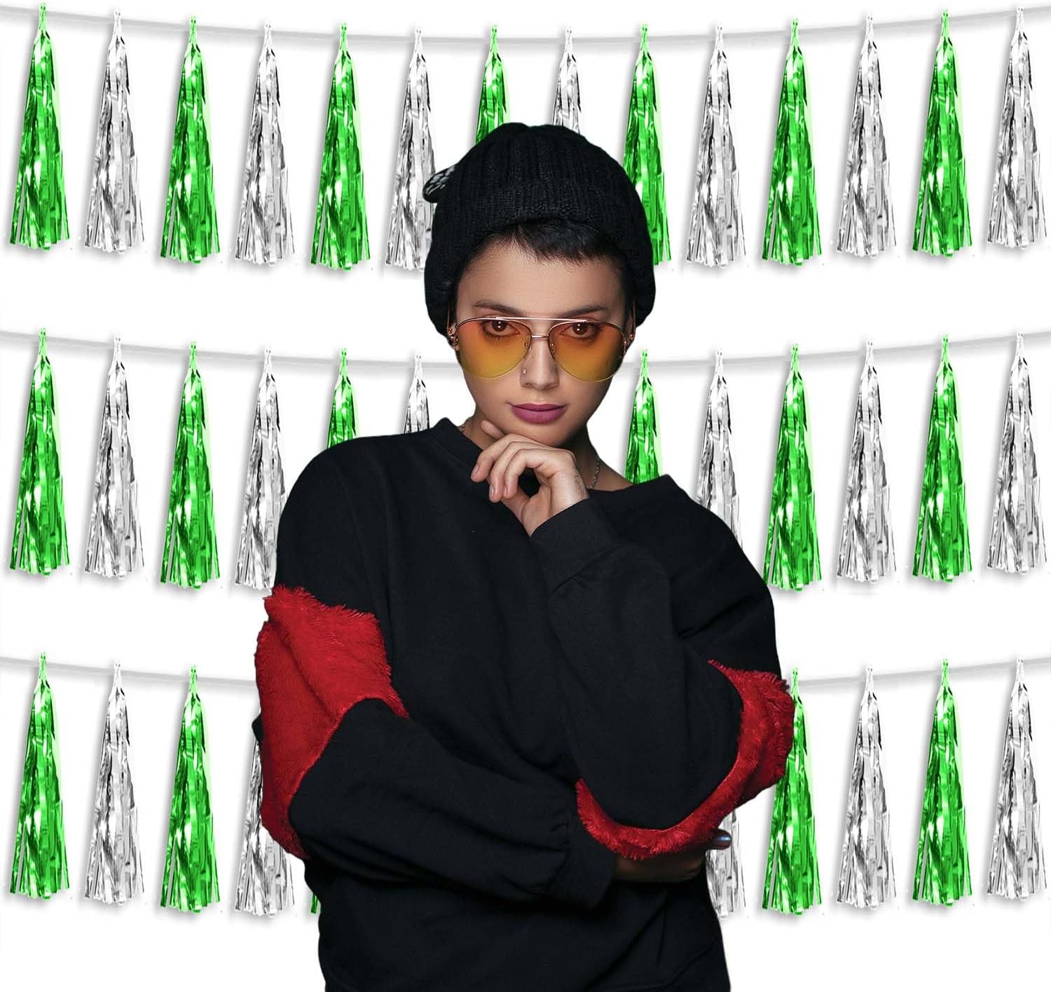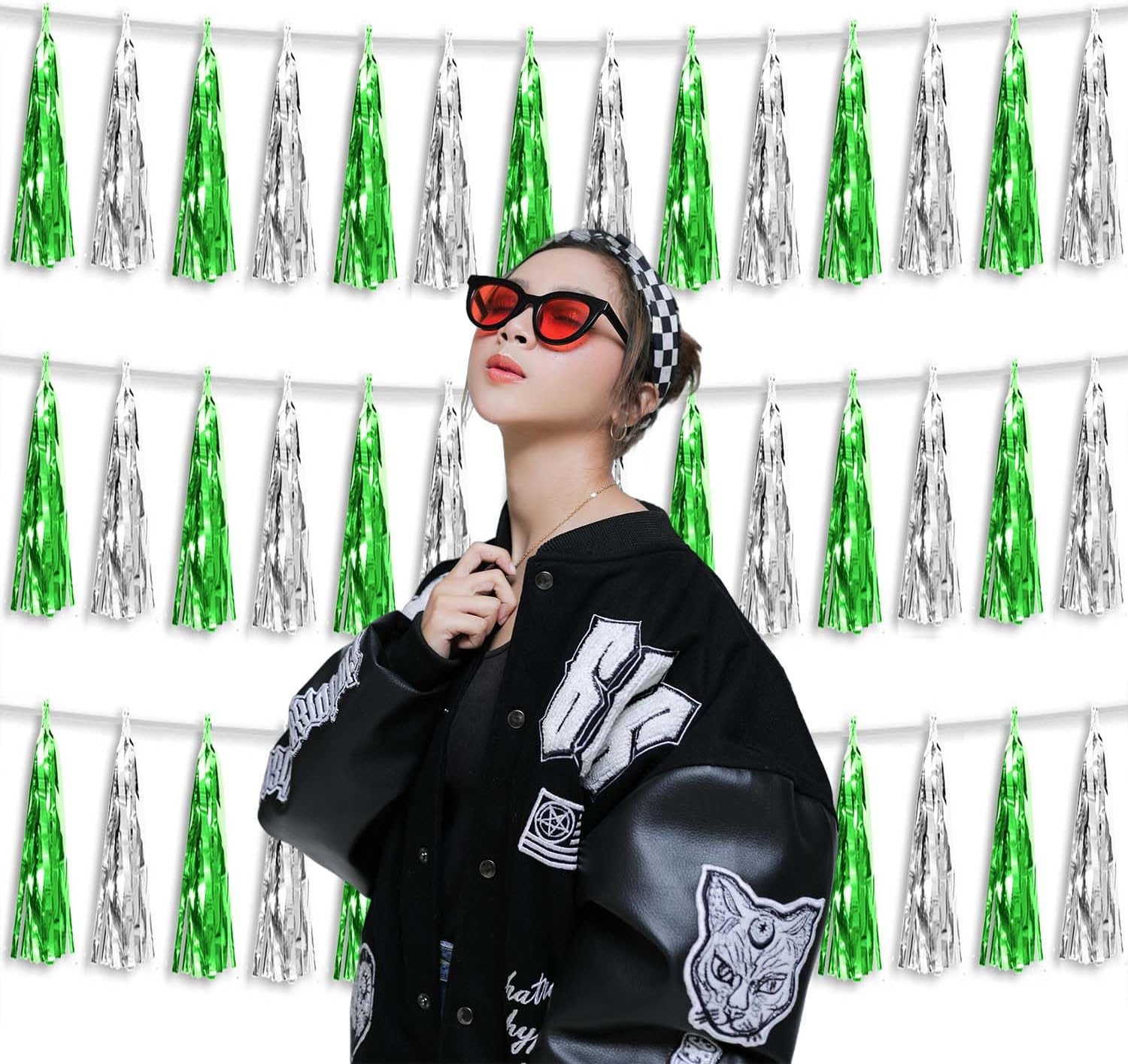 - 【Package Includes】The total length of the green silver birthday tassels banner is 30 feet, divided into 3 strips, each 10 feet long. Each banner contains 15 tassels, and each tassel measures 14 inches, for birthday decorations many occasions uitable for Patriotic display, Homecoming Float, Christmas Float, ecorative metal trailers, graduation floats etc
