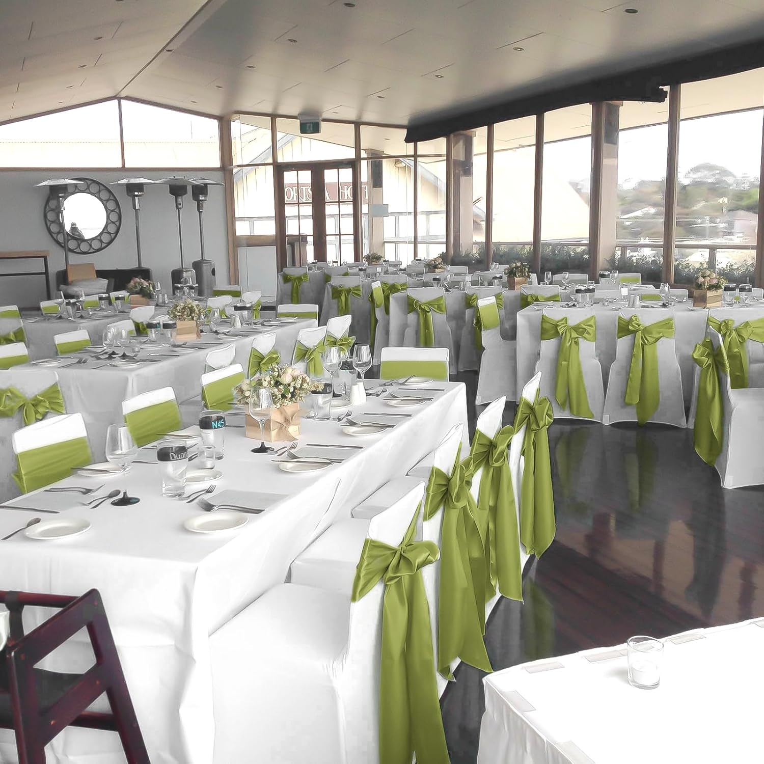 - 【Package Include】60 PCS satin chair sash.Size: 7" x108" or 275cm(l) x 17cm(w).Each package includes chair sashes only, without chair covers.These chair ties bring a modern twist to your chair's settings and let your chairs sparkle brightly. Satin sashes can be tied into wedding chairs, draped across any decoration, or used as attractive table runners.