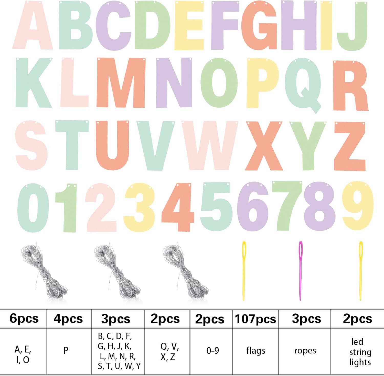 - DIY Banner Kit with Letters: you will get 107 pieces of letters and numbers, including 6 'A, E, I, O' letters, 4 'P' letters, 3 'B, C, D, G, H, J, K, L, letter M, N, R, S, T, U, letter W, Y, F shape' letters, 2 'Q, V, X, Z' letters and 2 '0-9' numbers, come with 3 ropes; Nice combination meet your various parties decorative demands