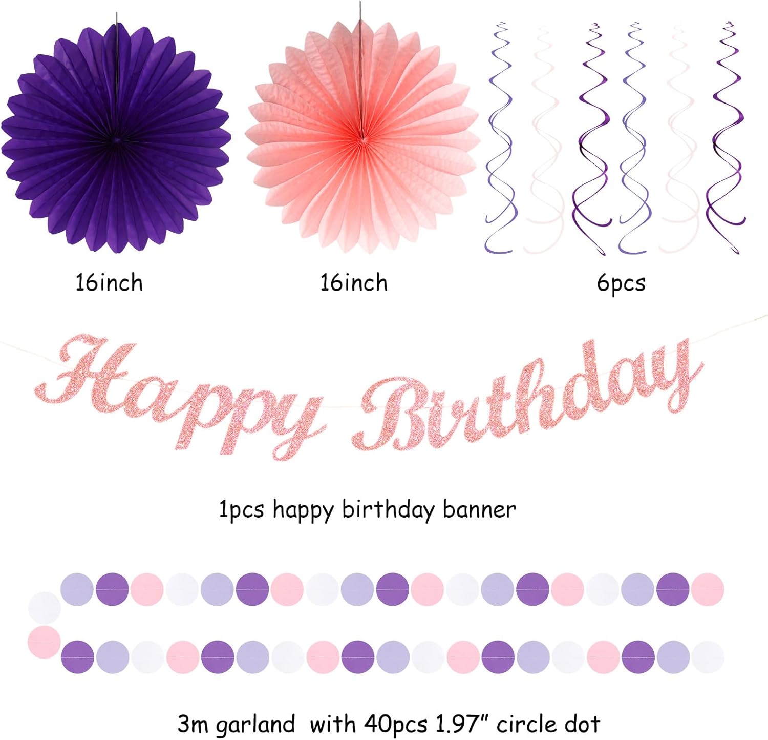 - 【Pink Light Purple Lavender Party Kits】This kits include 1pcs happy birthday banner, 1pcs circle dots paper banner, 4pcs tissue pom poms: 3pcs 10" and 1pcs 12" , 3pcs 8inch paper honeycom ball, 2pcs 8inch paper lantern, 4pcs 12inch paper flower fan, 6pcs Paper swirls hanging streamers.