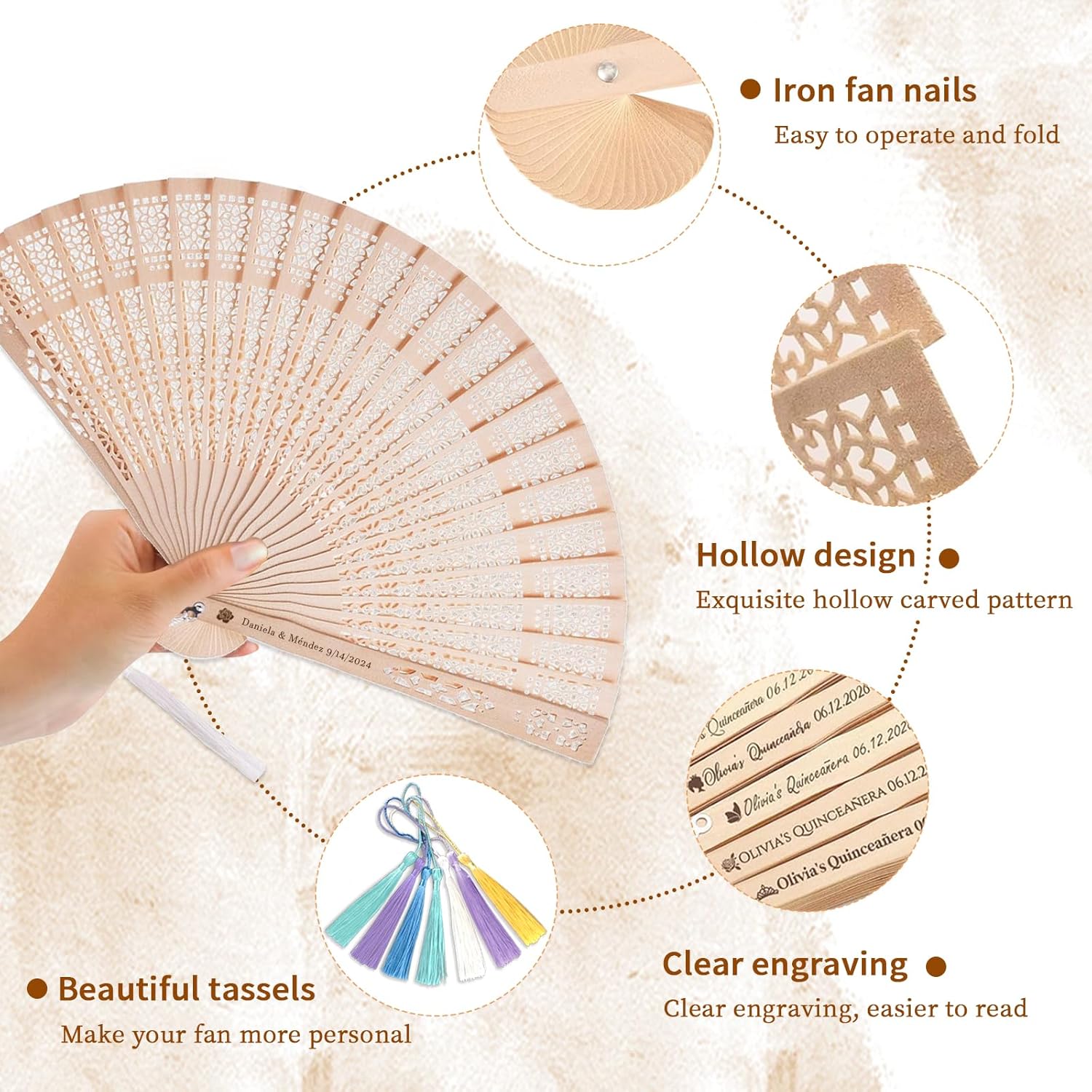 - ELEGANT PERSONALIZED WEDDING FANS: Crafted from natural sandalwood with a light, pleasant scent, these fans can be custom printed with names, logos, or messages — perfect for adding a special touch to your big day