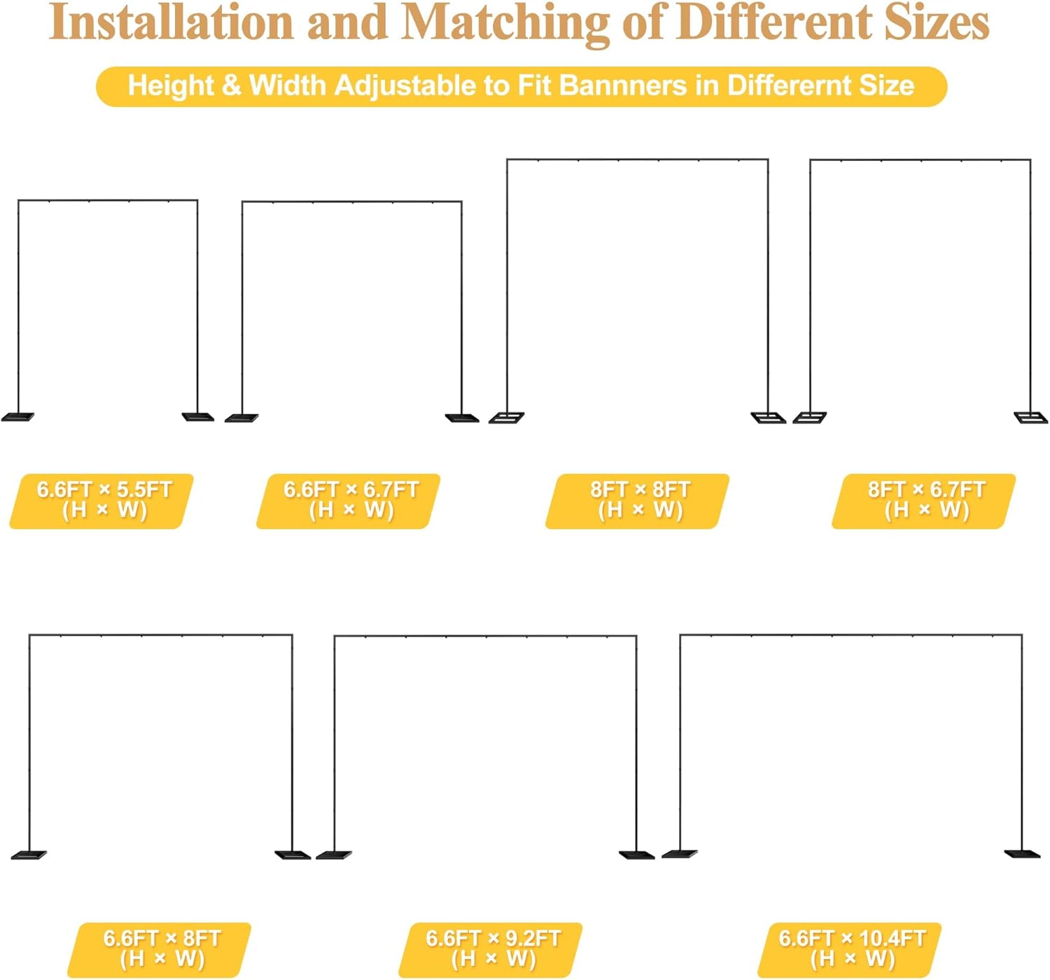 - 【Adjustable Backdrop Stand for Parties】Heavy duty backdrop stand can be freely assembled into 20 different sizes according to your needs. Minimum 6.6 x 5.5ft to maximum 8 x 8ft. Please refer to the instructions or product detail description for specific installation assembly size.