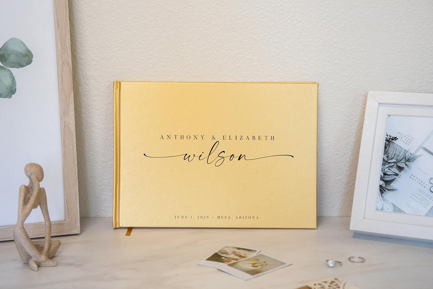 - Capture your special moments with our Personalized Guest Book, designed in a smooth gold metallic hardcover for a modern look. Measuring 11.5" x 8.5", this guest book features custom bride and groom names, including the couple’s last name in a cursive font, adding a unique and personal touch to your wedding decorations.