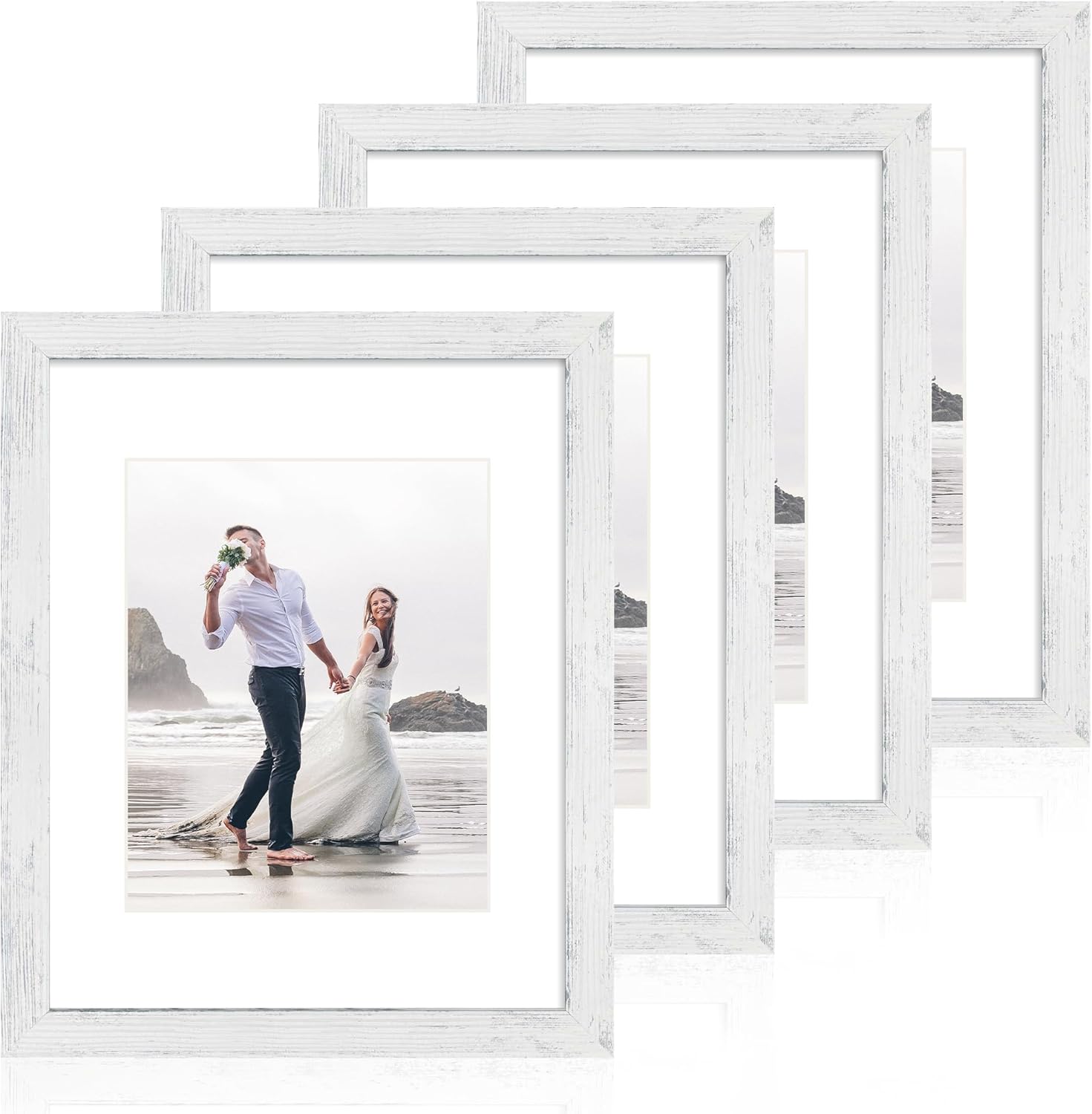 11x14 Picture Frame Set of 4 with Tempered Glass, Distressed White Frame Display 8x10 Picture with Mat or 11 x 14 Without Mat, Wood Rustic Photo Frames for Horizontal or Vertical Wall Mounting