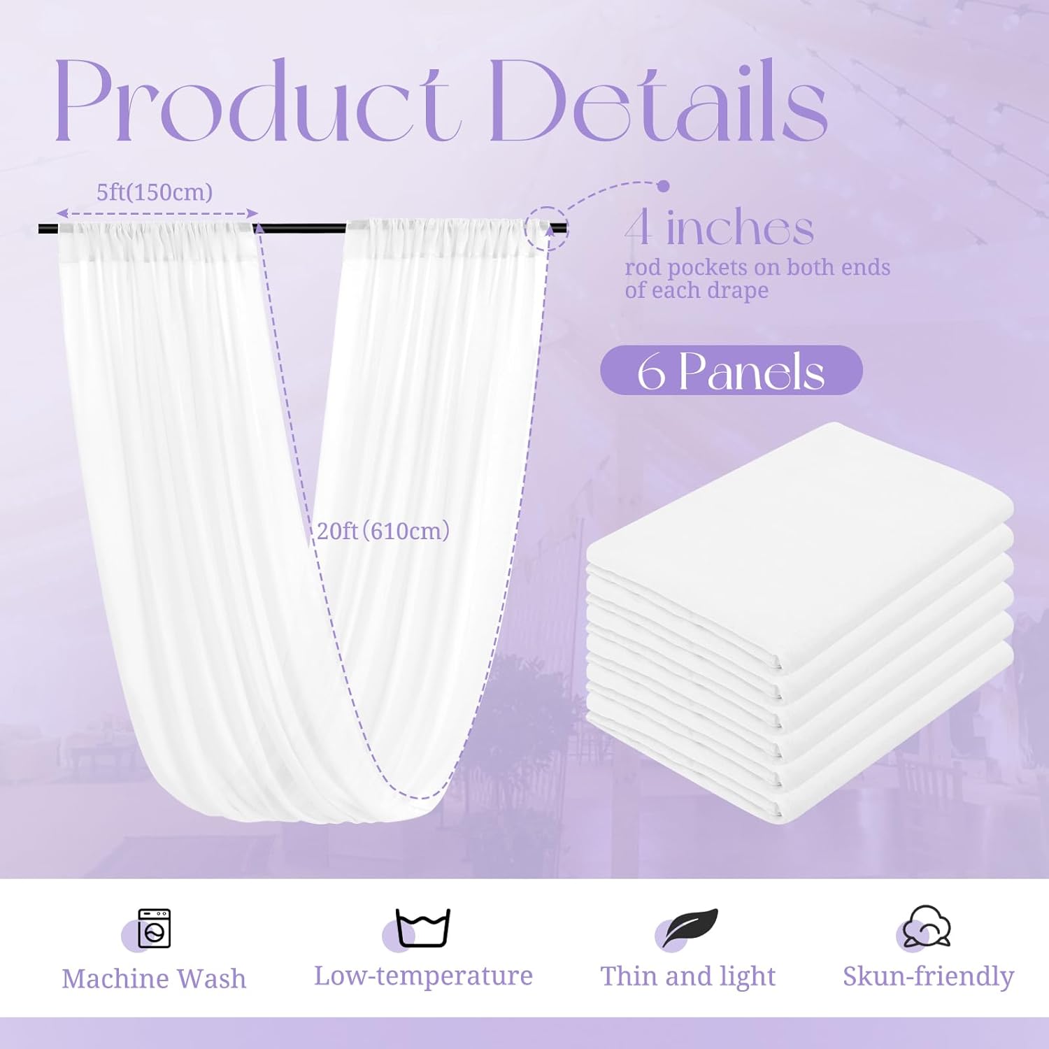 - 【Package Includes】The package will include 6 panels white wedding ceiling drapes (Not include stand), each wedding extra long curtain measures 5 feet (60inch)wide x 20 feet(240inch) long.The sufficient quantity can meet your demands for decorating your weddings, parties, receptions.