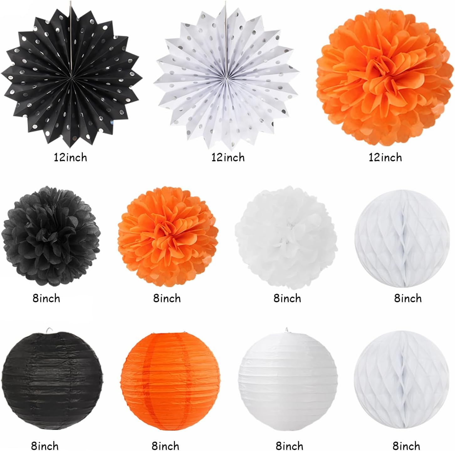 - 【Black White Orange Party Kits】This kits include 1pcs happy halloween banner, 1pcs circle dots paper banner, 4pcs tissue pom poms: 3pcs 10" and 1pcs 12" , 3pcs 8inch paper honeycom ball, 2pcs 8inch paper lantern, 4pcs 12inch paper flower fan, 6pcs Paper swirls hanging streamers.