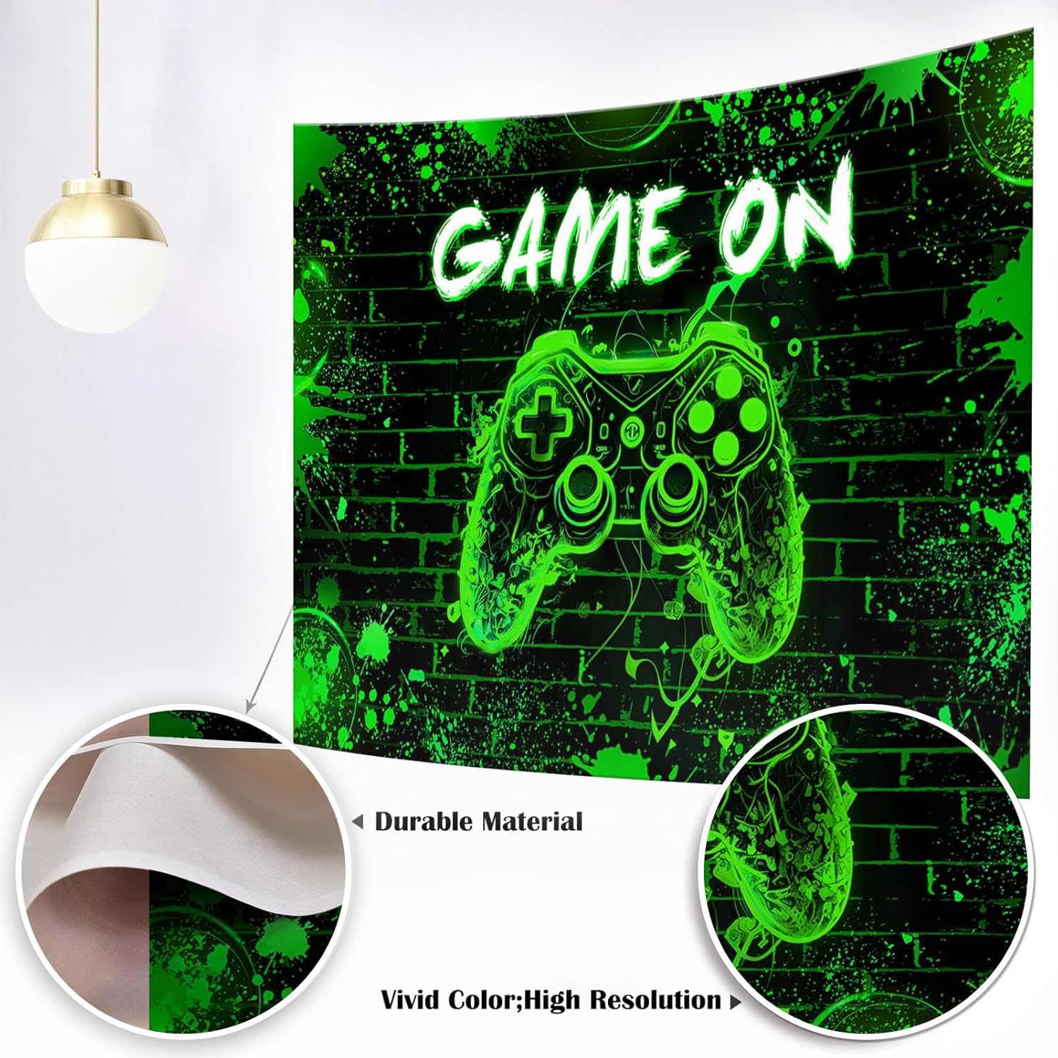 Mocsicka Game On Backdrop Video Game for Boys Level Up Birthday Party Decoration Game Night Arcade Neon Glow Gamer Banner Photography Background (Green, 10x7ft(120"x82"))