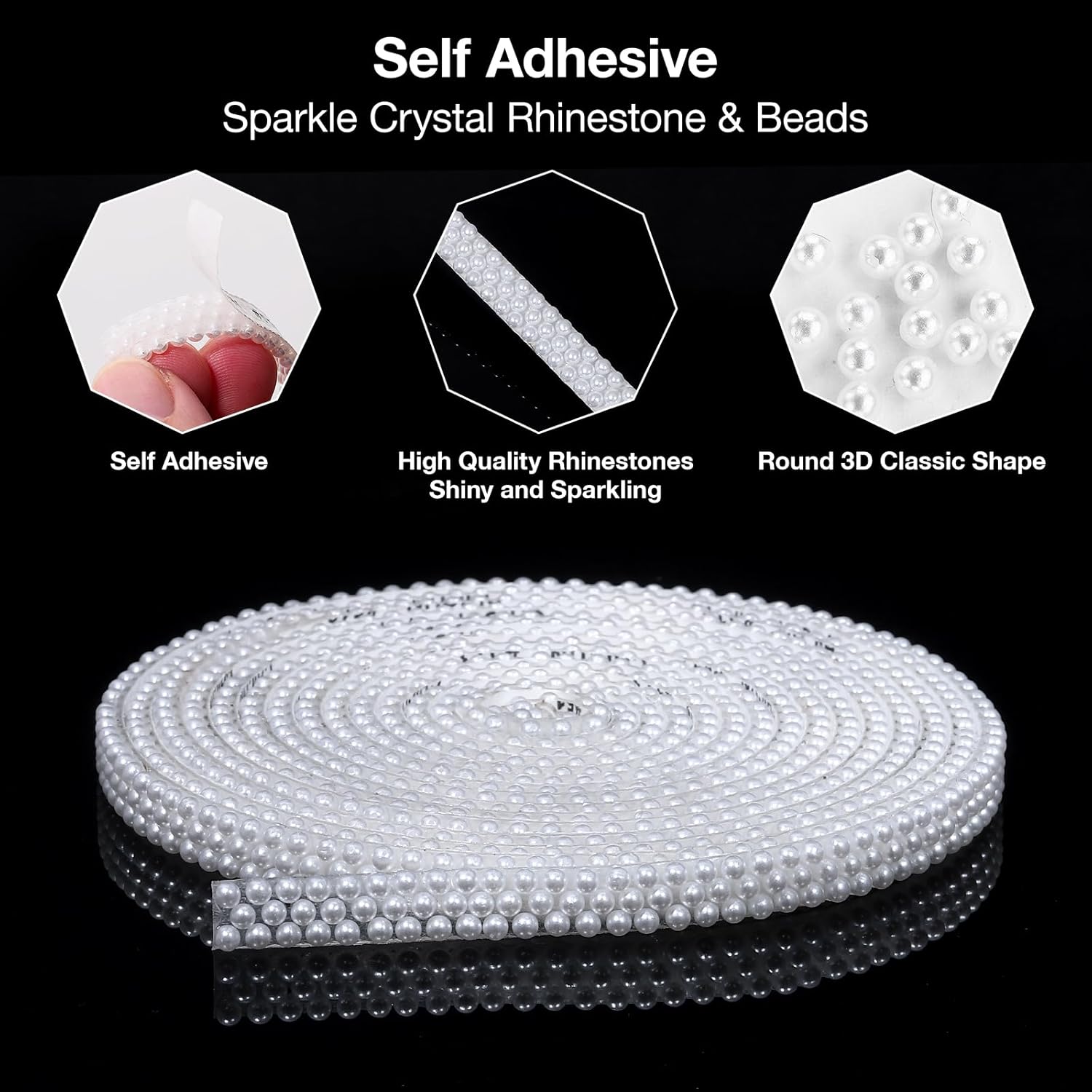 - Self-Adhesive Pearls Ribbon: The self-adhesive design with backing glue makes it possible to stick anywhere as long as the surface is smooth and clean. You cut the pearls ribbon into different lengths with scissors, then peel off the back paper of the sticker and paste it on the project you want to decorate.