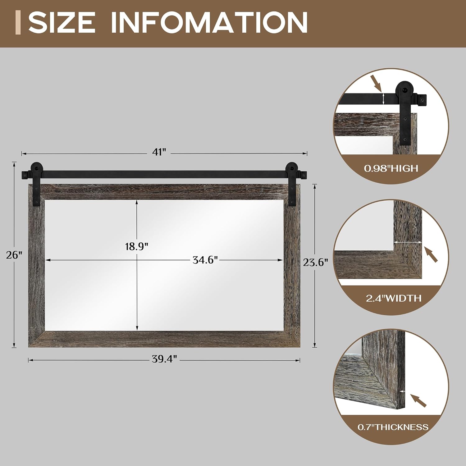 - EASY TO INSTALL: The overall size of this rustic mirror is 40.9 x 26 x 0.67 inch, and the display size of the mirror is 34.6 x 18.9 inch. The track is 41 inch. You can fix the pulleys to the mirror first, then mount the track on the wall and finally snap the pulleys onto the track to complete the hanging